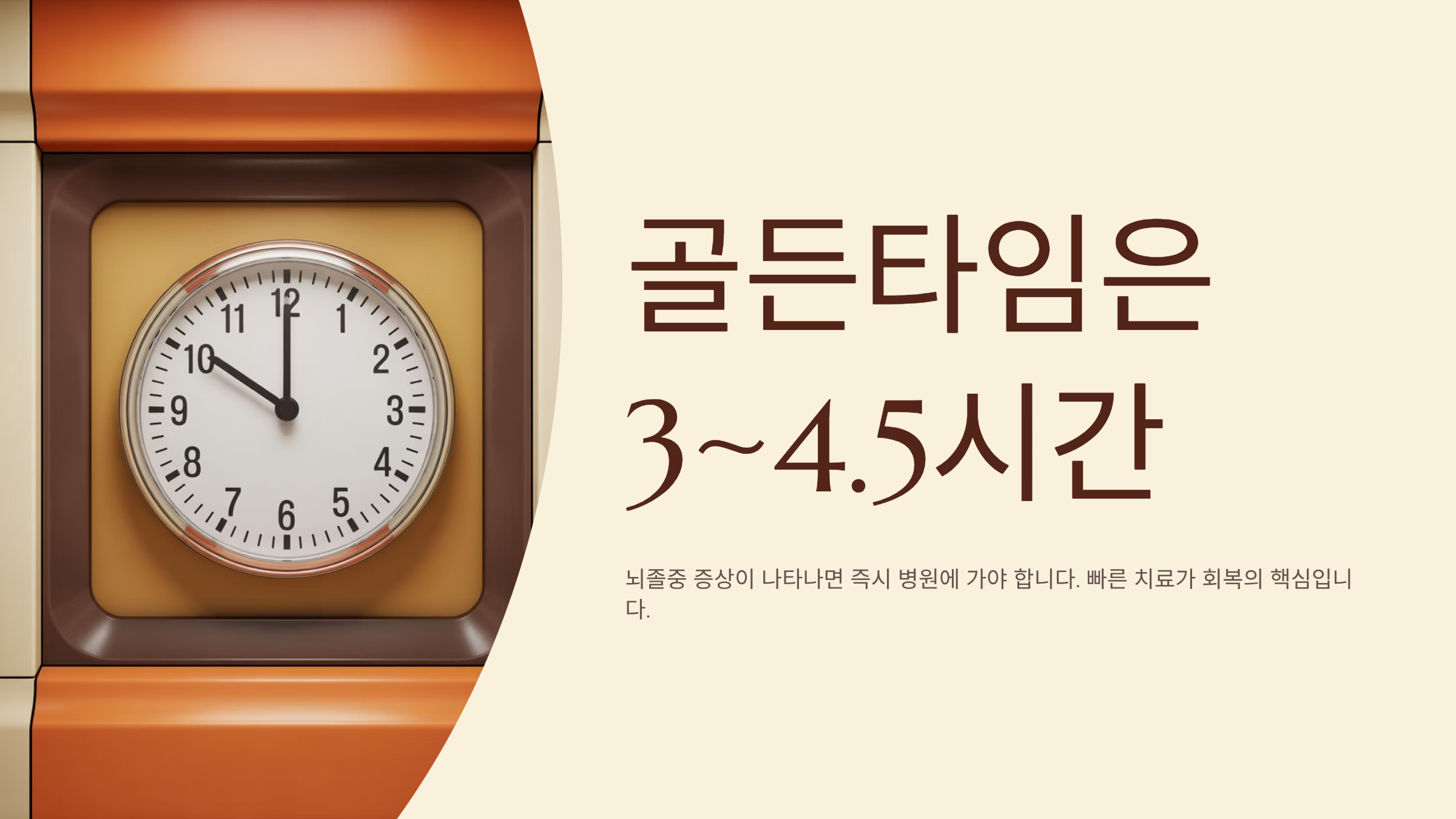 A4. 증상 발생 후 3~4.5시간 이내예요. 이 시간 내에 혈전용해제 치료를 받으면 회복 가능성이 높아져요.