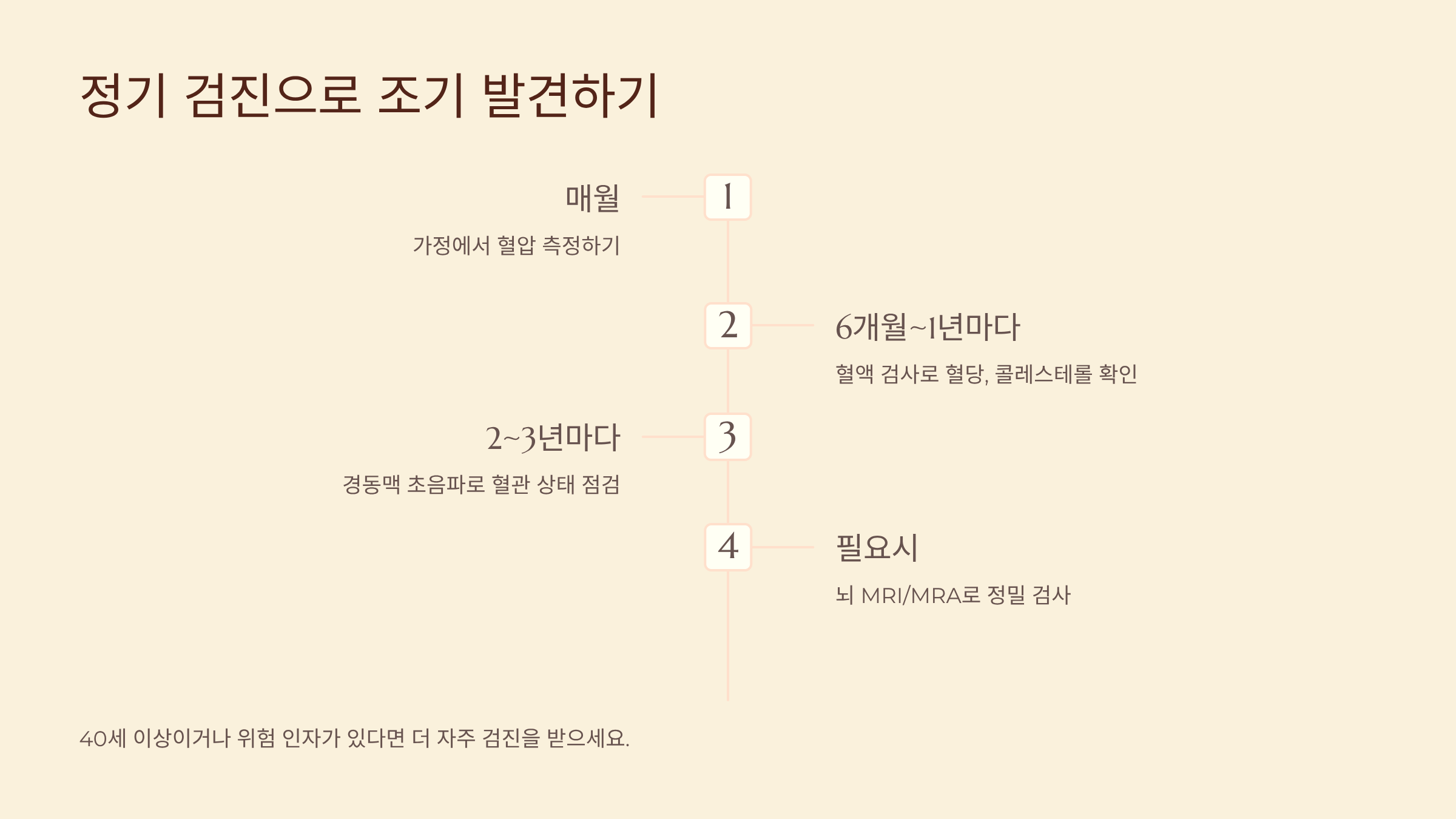 뇌혈관 검사도 중요해요. 경동맥 초음파로 목 혈관의 상태를 확인할 수 있고, MRA나 CTA 같은 영상 검사로 뇌혈관의 협착이나 동맥류를 발견할 수 있어요. 심전도 검사로 심방세동 같은 부정맥을 찾아낼 수도 있어요. 특히 가족력이 있거나 위험 인자가 여러 개 있다면 더 적극적인 검사가 필요해요.