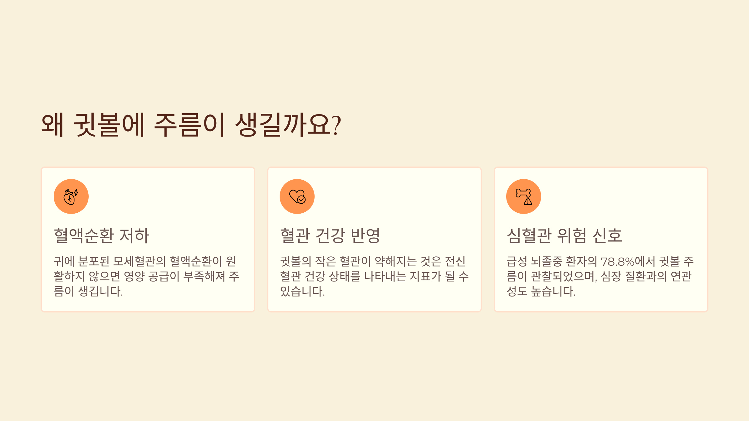 이런 현상이 나타나는 이유는 귀에 분포된 모세혈관의 혈액순환과 관련이 있어요. 혈관이 막히면서 귀로 가는 영양 공급이 부족해지고, 이것이 주름으로 나타나는 거죠. 실제로 급성 뇌졸중 환자의 78.8%에서 귓볼 주름이 관찰되었다는 연구 결과도 있어요.