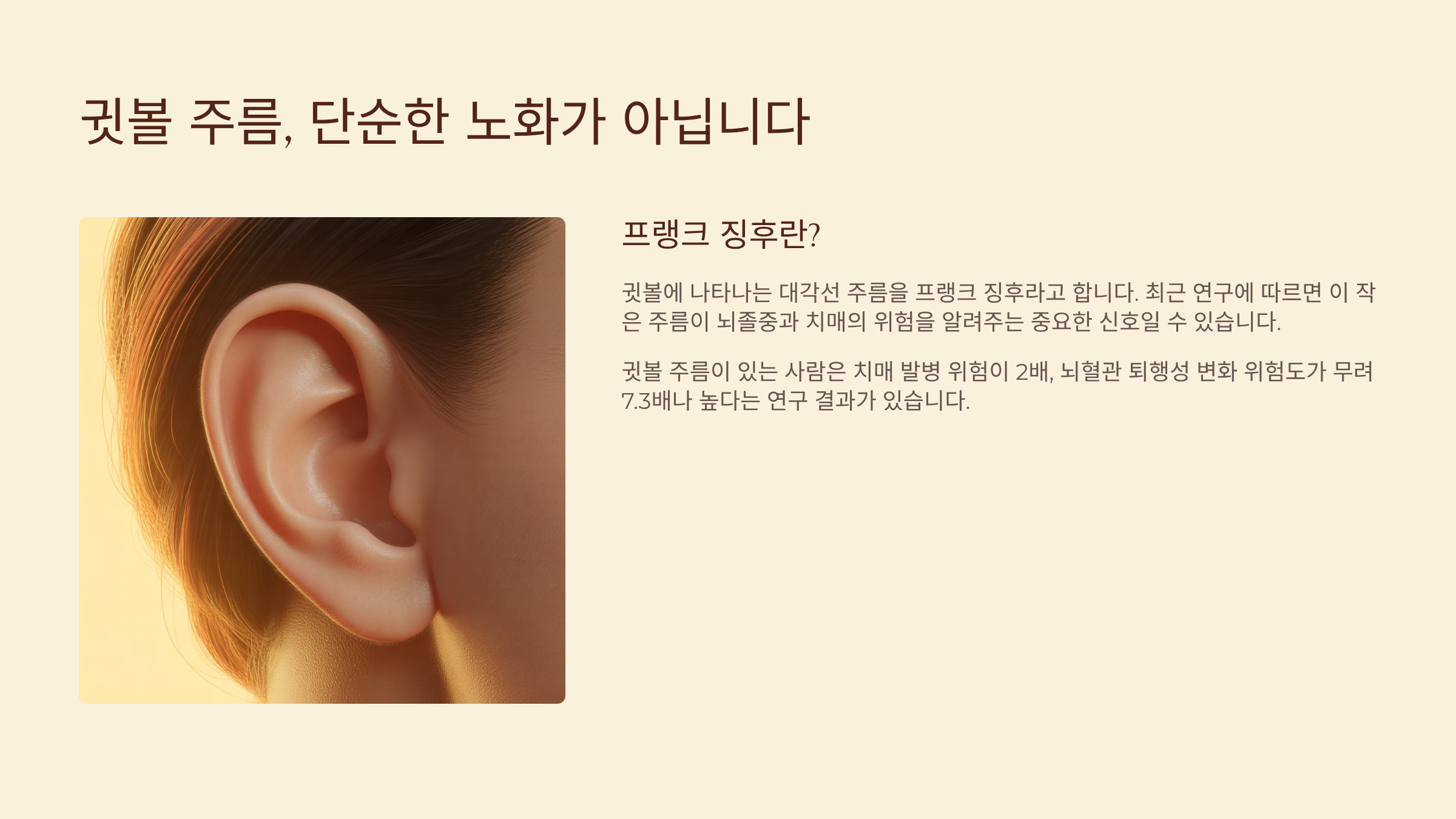 혹시 귓볼에 대각선 주름이 있으신가요? 단순히 나이가 들어서 생긴 주름이라고 생각하셨다면, 오늘부터는 조금 다르게 보셔야 할 거예요. 최근 연구에 따르면 이 작은 주름이 우리 몸의 중요한 건강 신호일 수 있다고 해요.