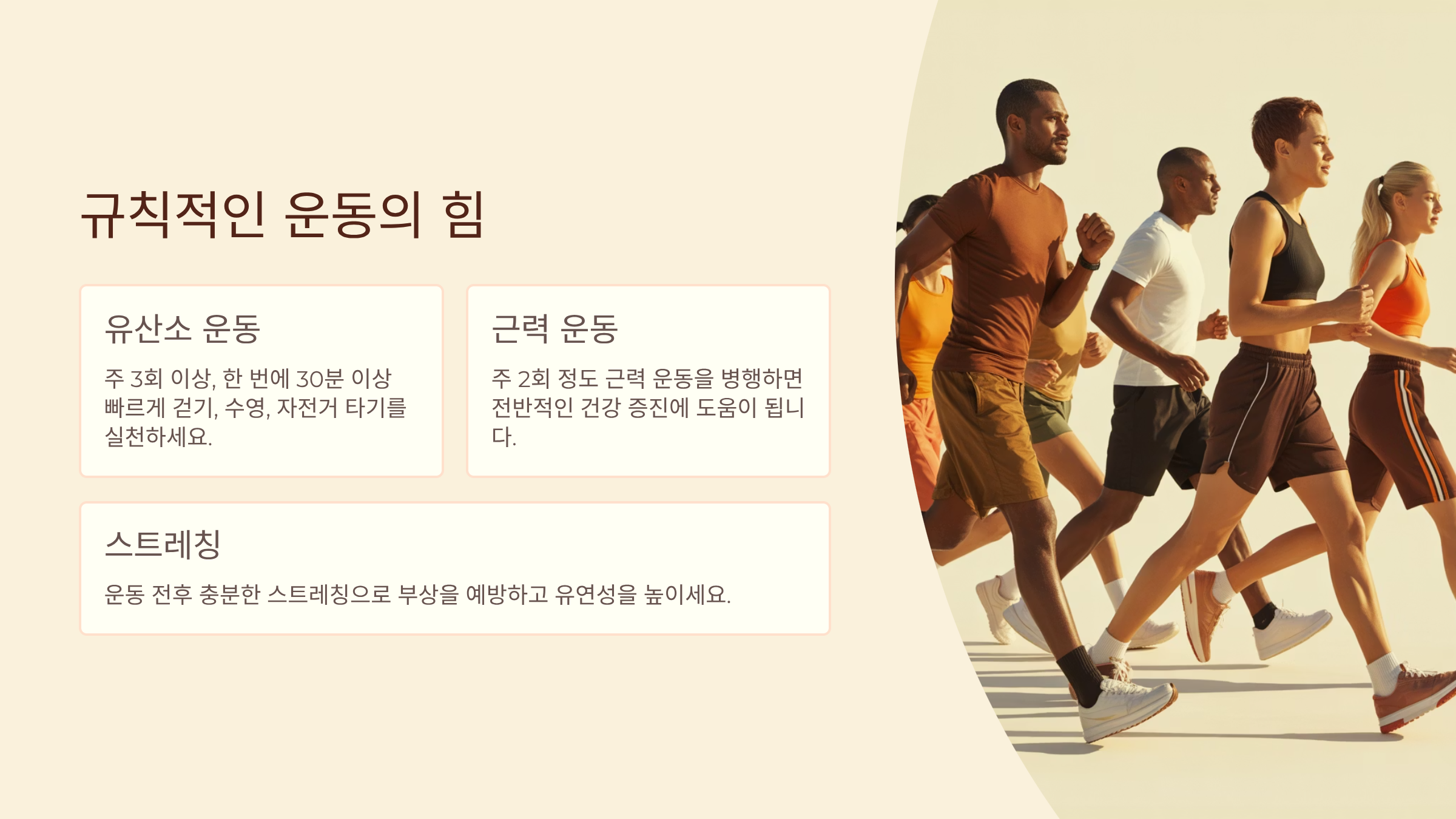 운동은 혈관을 젊게 유지하는 비결이에요. 빠르게 걷기, 수영, 자전거 타기 같은 유산소 운동을 규칙적으로 하면 혈압과 콜레스테롤을 낮출 수 있어요. 근력 운동도 주 2회 정도 병행하면 더 좋아요. 운동 전후에는 충분한 스트레칭으로 부상을 예방하는 것도 중요해요.
