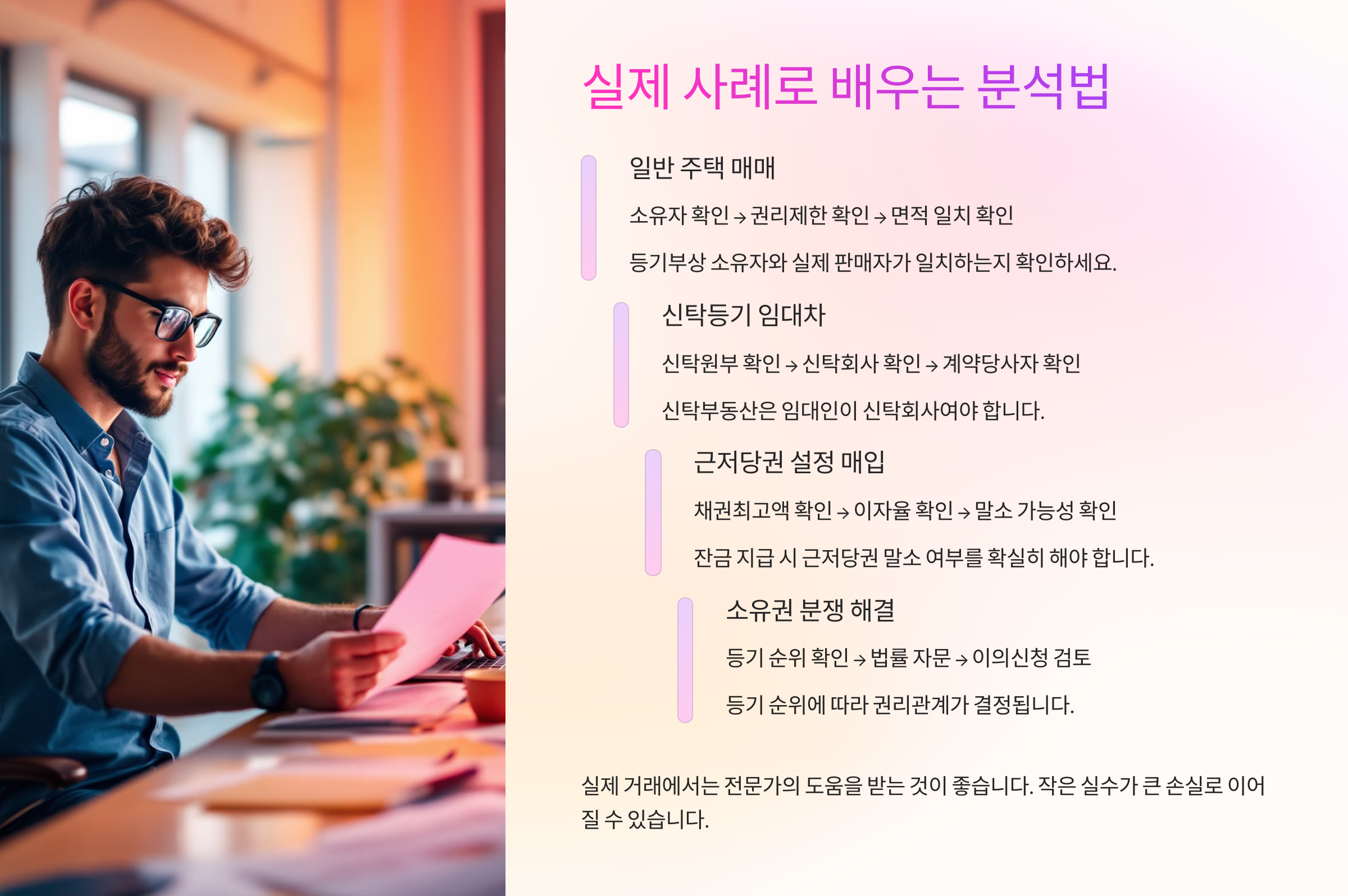 3️⃣ 신탁등기 또는 수탁자 등재: 계약 상대방이 실권리자가 아닐 수 있어요. 이럴 때는 신탁 원부 확인, 수익자/위탁자 검토도 반드시 해야 해요.