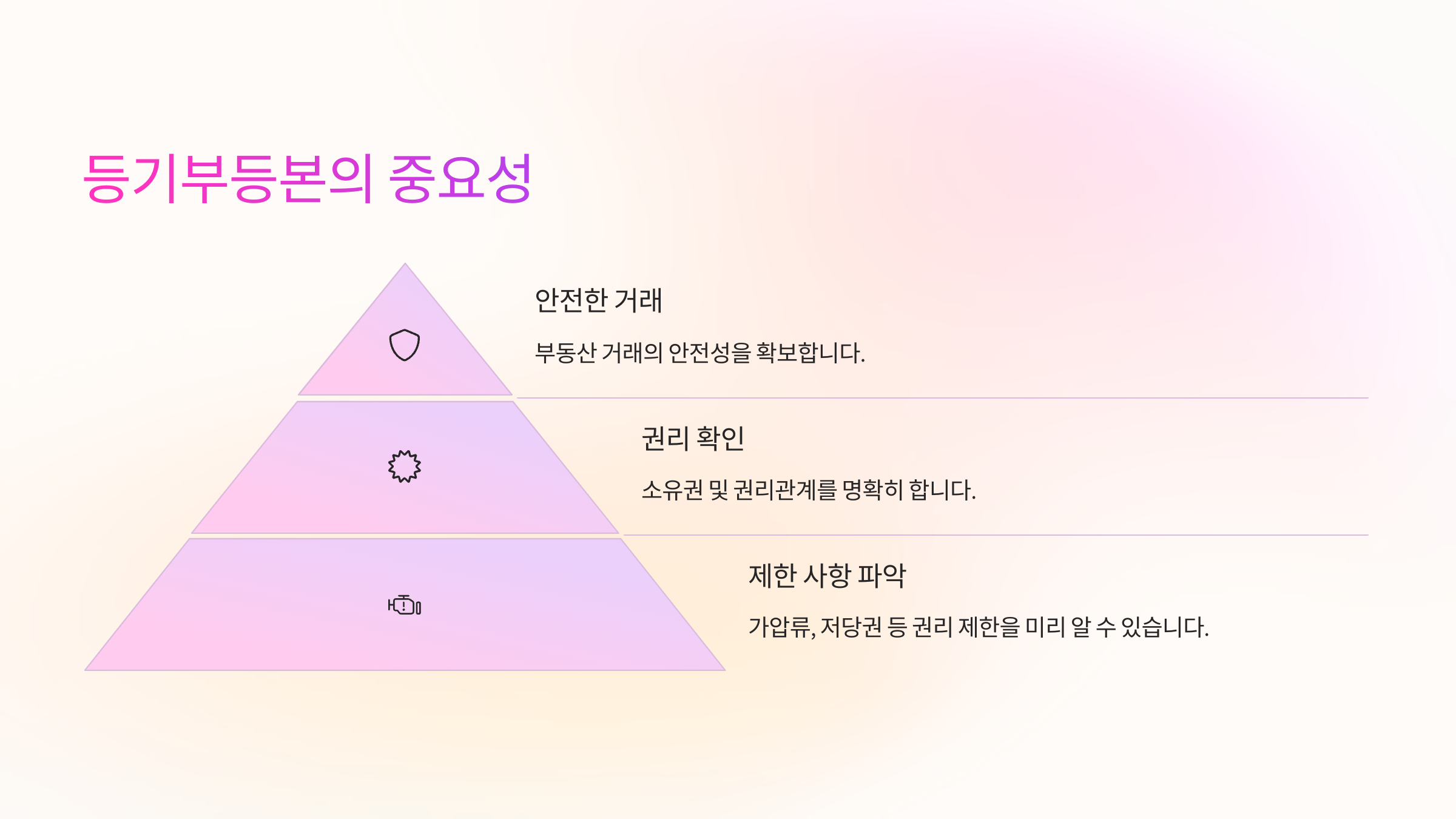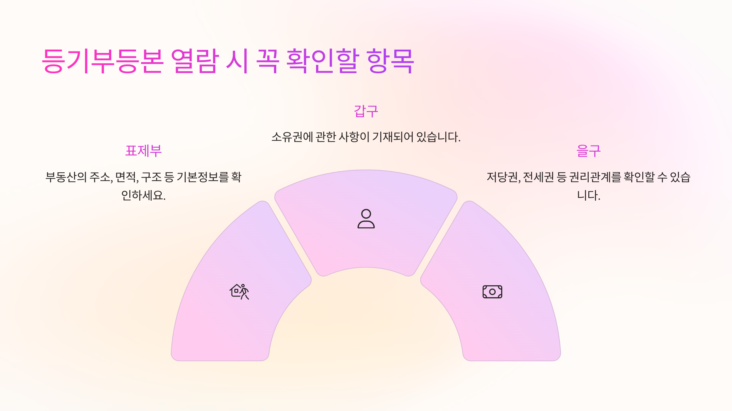 이 문서는 크게 세 가지 부분으로 나뉘어요. 표제부, 갑구, 을구. 표제부에는 부동산의 주소, 구조, 면적 등 기본 정보가 들어 있고, 갑구에는 소유권 관련 내용, 을구에는 담보물권과 같은 권리관계가 기록돼 있어요.