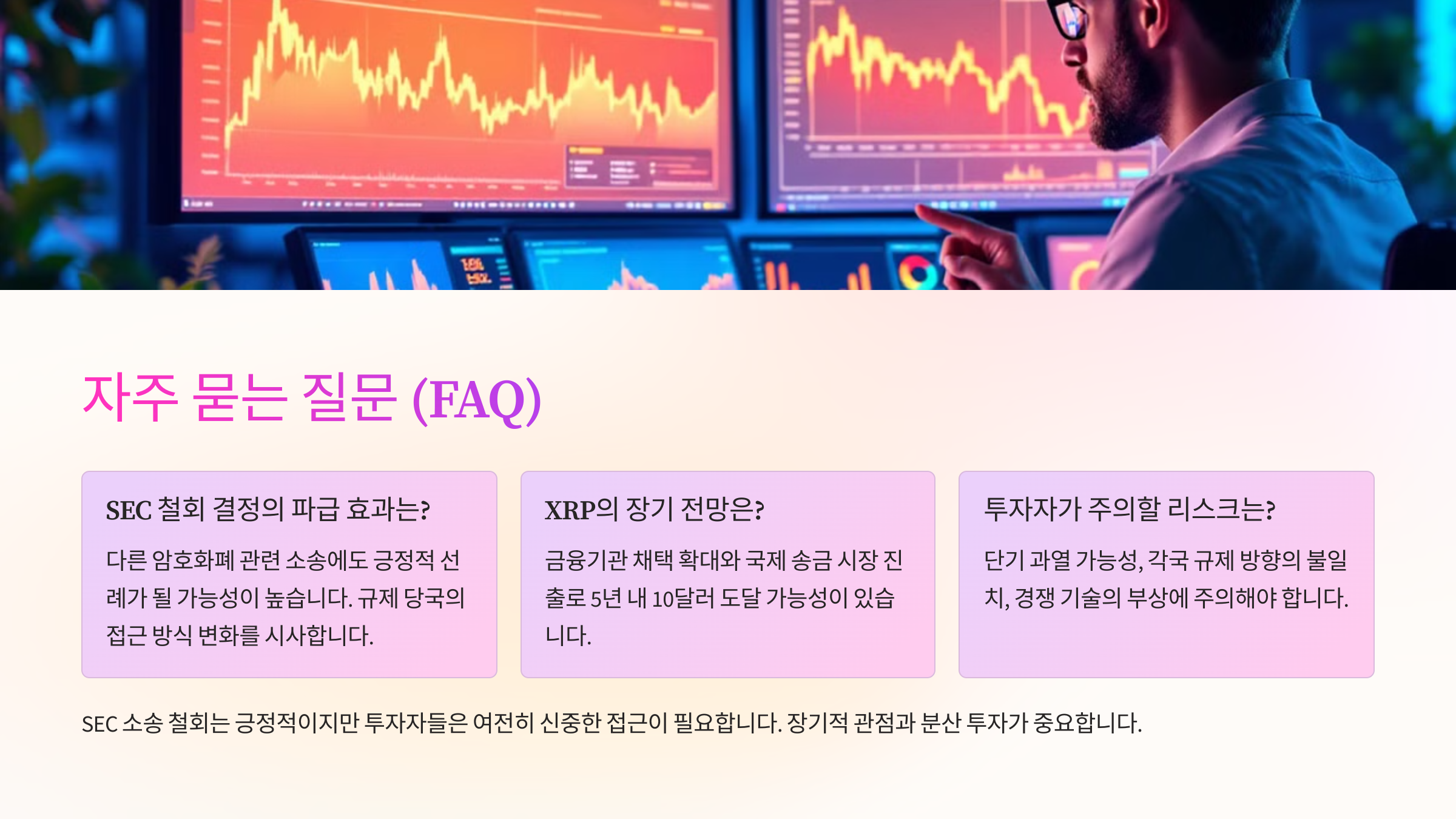 미국 증권거래위원회(SEC)는 2020년부터 리플(Ripple)을 미등록 증권 판매 혐의로 기소해왔어요. 5년 넘게 이어진 이 소송은 암호화폐 업계에 큰 불확실성으로 작용했죠. 그런데 이번에 SEC가 항소를 전면 철회하면서 분위기가 급변했어요. 📉➡📈