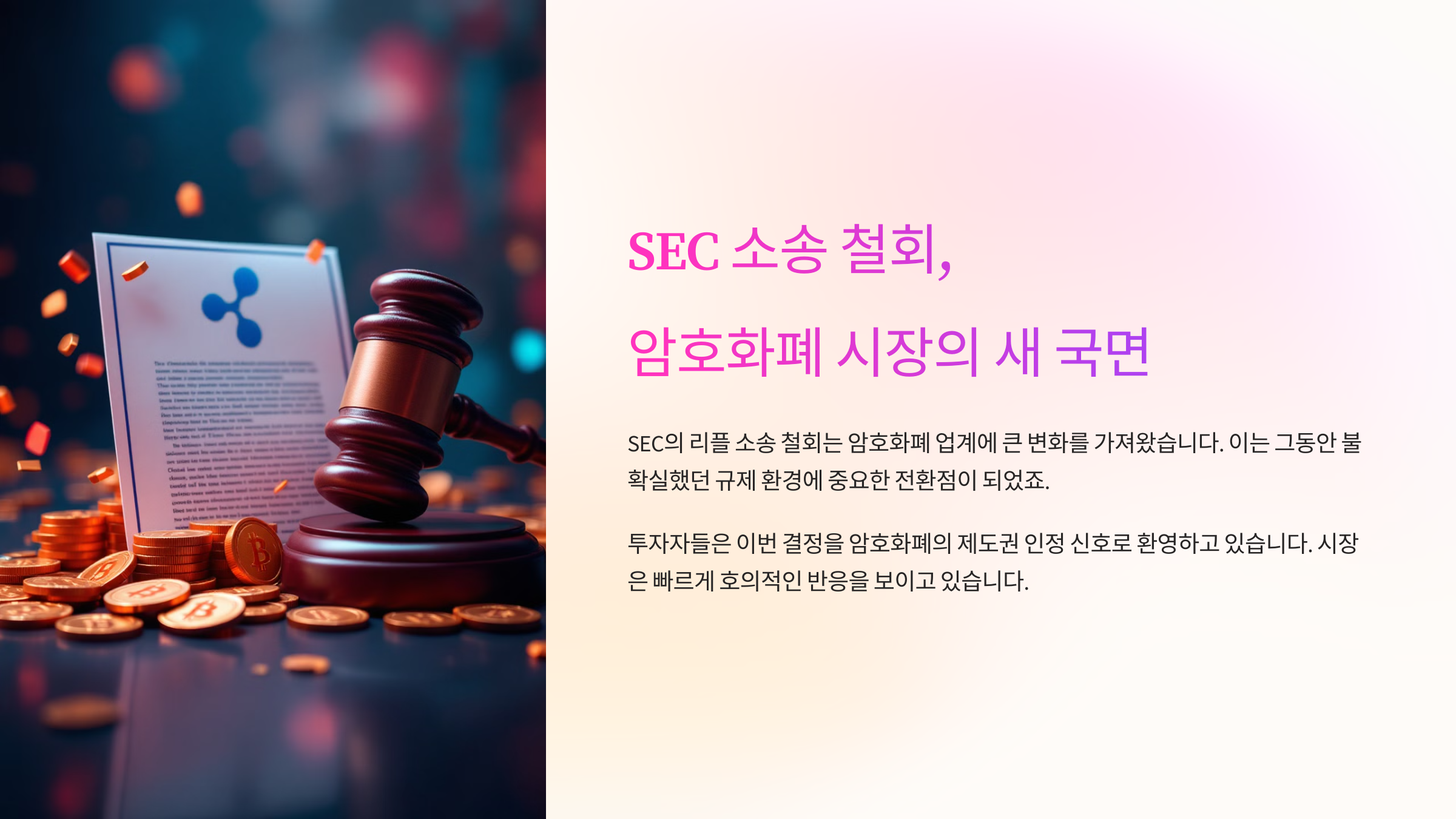 이번 글에서는 리플 소송 종결이 왜 중요한지, 시장에 어떤 변화가 일어나고 있는지, 그리고 앞으로 투자자들이 어떤 흐름을 주목해야 할지 정리해볼게요. 😊