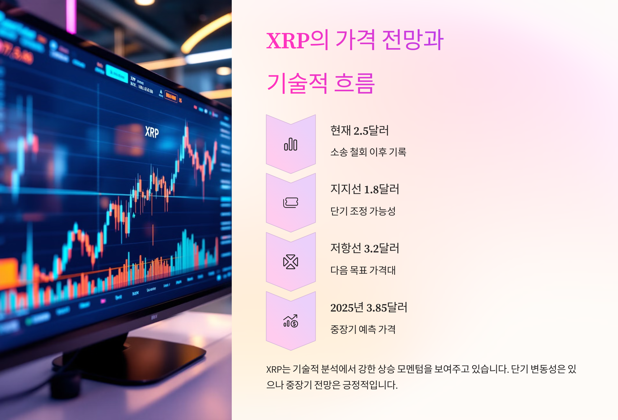 기술적으로 XRP는 엘리엇 파동 기준 3파동에 진입한 것으로 분석되고 있어요. 이는 강한 상승 흐름이 이어지는 구간으로, 다음 주요 목표는 4.50달러와 6달러 선이에요. 📊