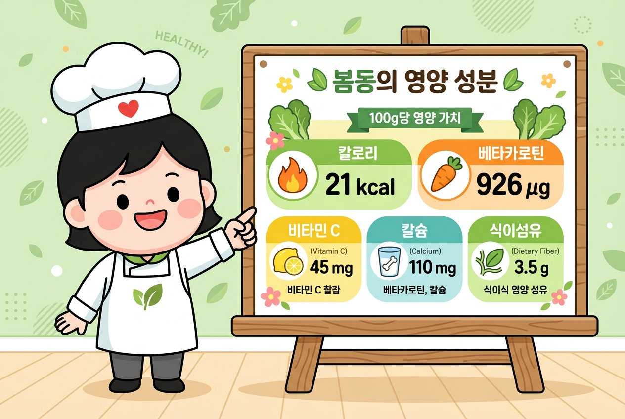 봄동은 100g당 약 21kcal에 불과한 저칼로리 채소입니다. 국가표준 식품성분표에 따르면 봄동 100g당 베타카로틴이 926㎍ 함유되어 있어, 일반 배추(145㎍)의 약 6배 이상입니다.