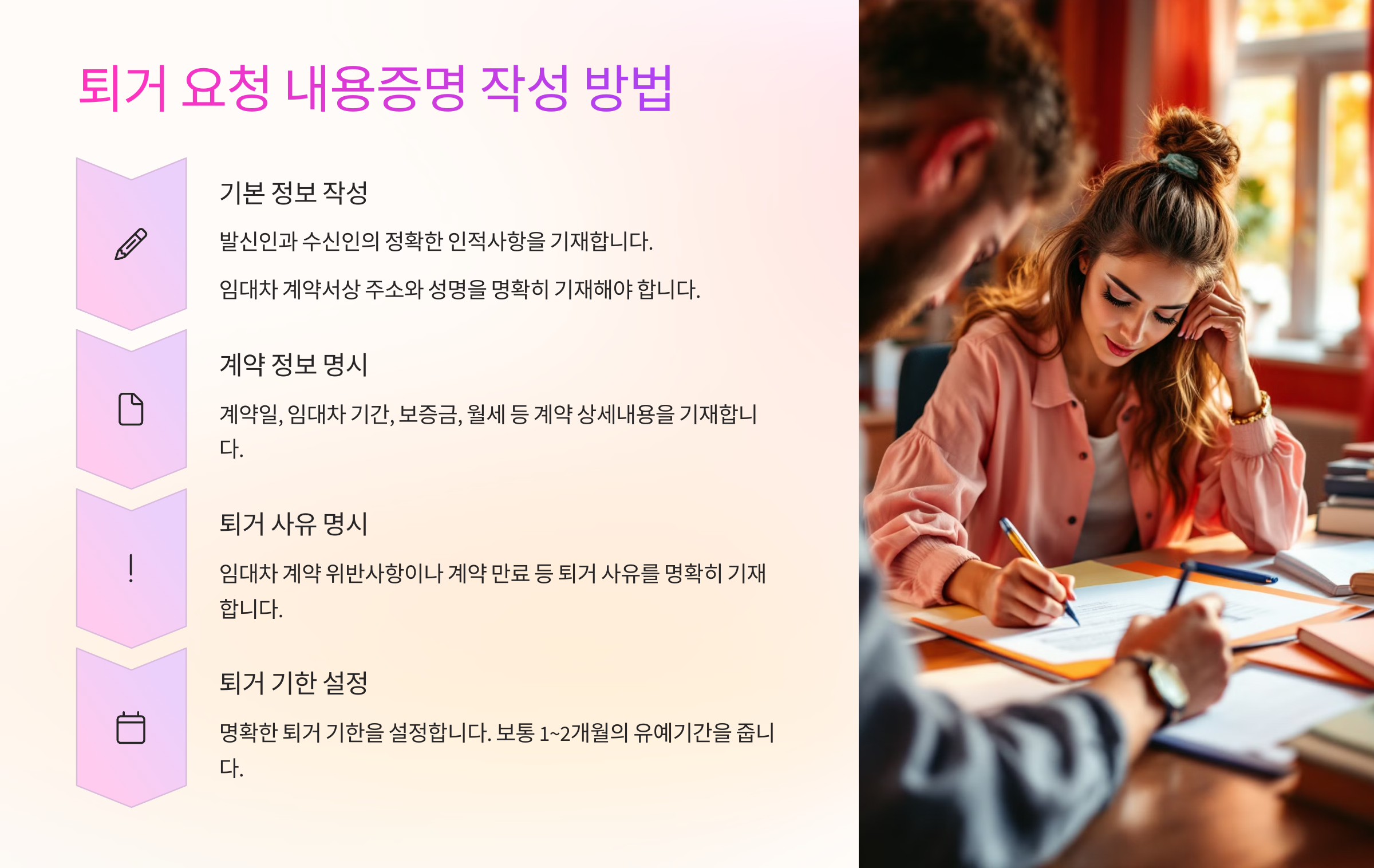 부동산 임대차 계약이 종료되었음에도 세입자가 퇴거하지 않는다면, 임대인은 적절한 법적 절차를 통해 해결해야 해요. 이때 가장 먼저 할 수 있는 조치가 바로 퇴거 요청 내용증명을 보내는 것이에요. 🏠📜