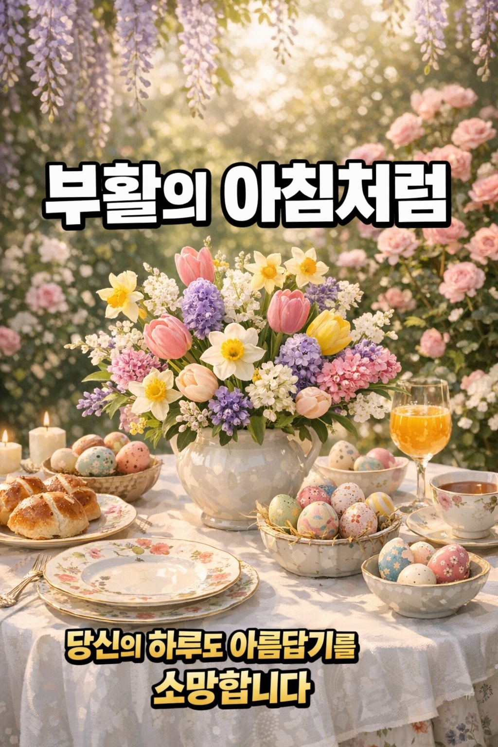 이미지 4. 봄꽃 가득한 정원 테이블 세팅 – "부활의 아침처럼 당신의 하루도 아름답기를 소망합니다."