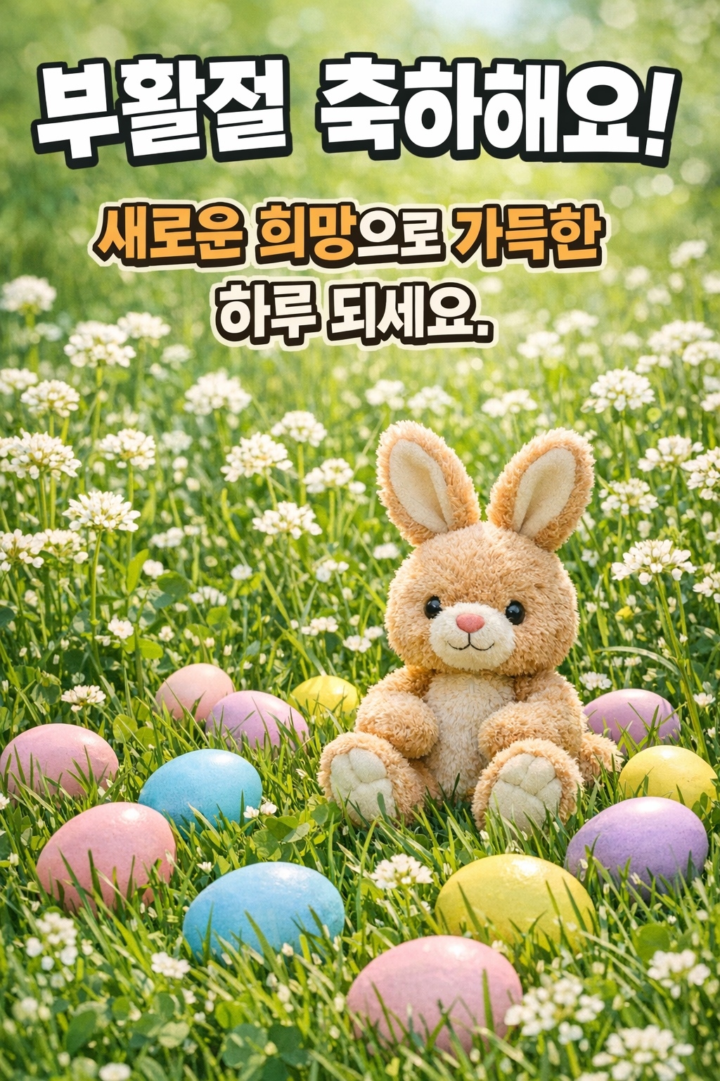이미지 3. 잔디밭 위 파스텔 달걀과 토끼 인형 – "부활절 축하해요! 새로운 희망으로 가득한 하루 되세요."