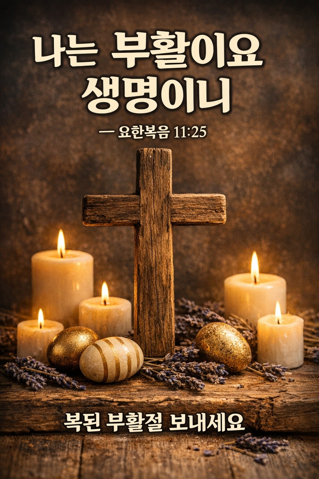 이미지 5. 은은한 캔들 빛 속 십자가와 부활절 달걀 – "나는 부활이요 생명이니 – 요한복음 11:25. 복된 부활절 보내세요."