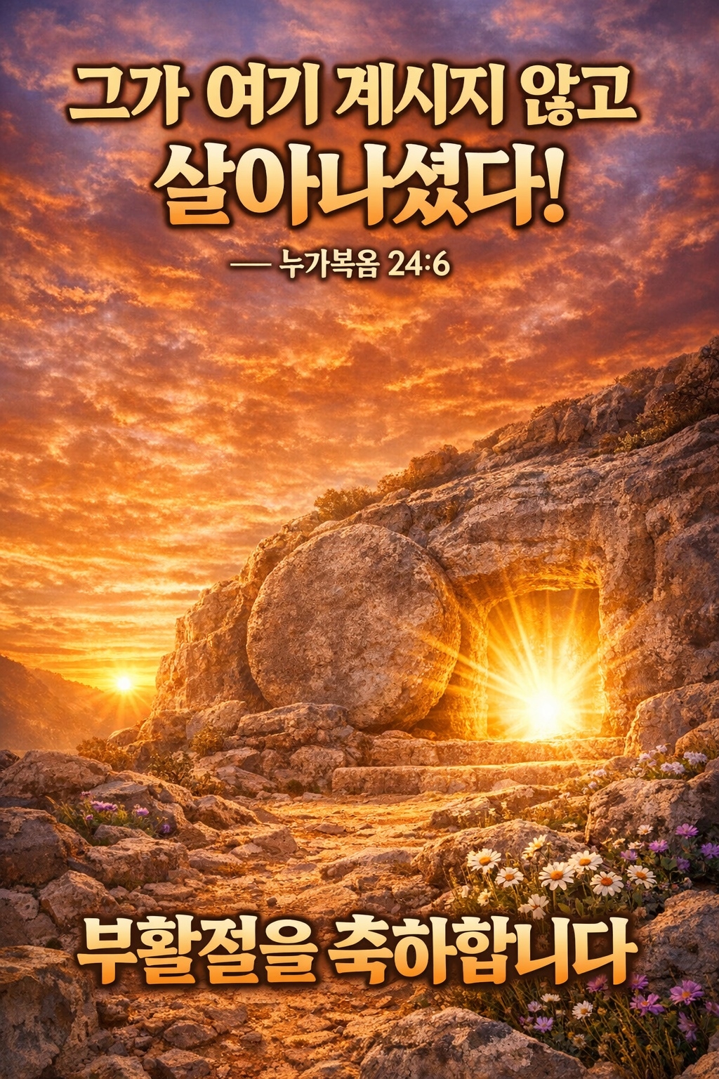 이미지 9. 일출 풍경 속 빈 무덤과 돌 – "그가 여기 계시지 않고 살아나셨다! (누가복음 24:6) 부활절을 축하합니다."