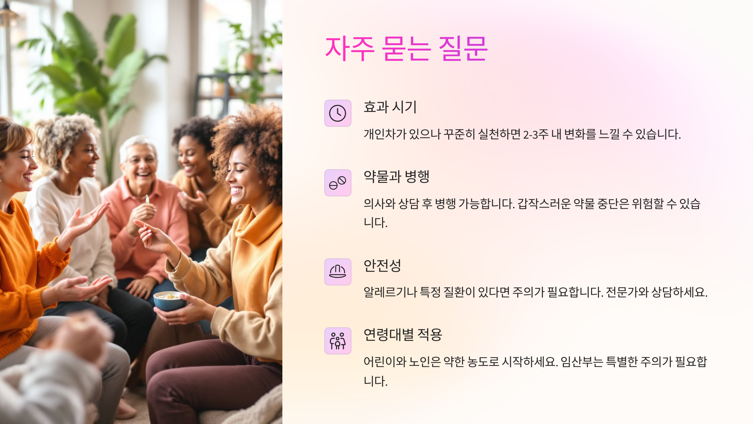 A1. 증상 완화에는 효과적이지만, 개인차가 있어요. 꾸준한 실천이 중요해요.