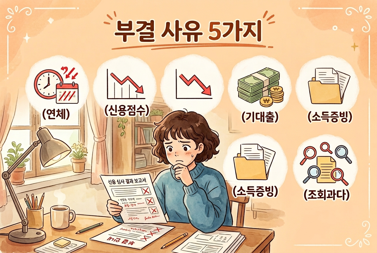 가장 흔한 부결 사유는 현재 연체 중이거나 단기 연체 이력이 있는 경우, 신용점수가 NICE 기준 539점 이하로 너무 낮은 경우, 기존 대출이 과다한 경우, 소득 증빙이 불충분한 경우, 그리고 대출 조회 건수가 과도한 경우예요.