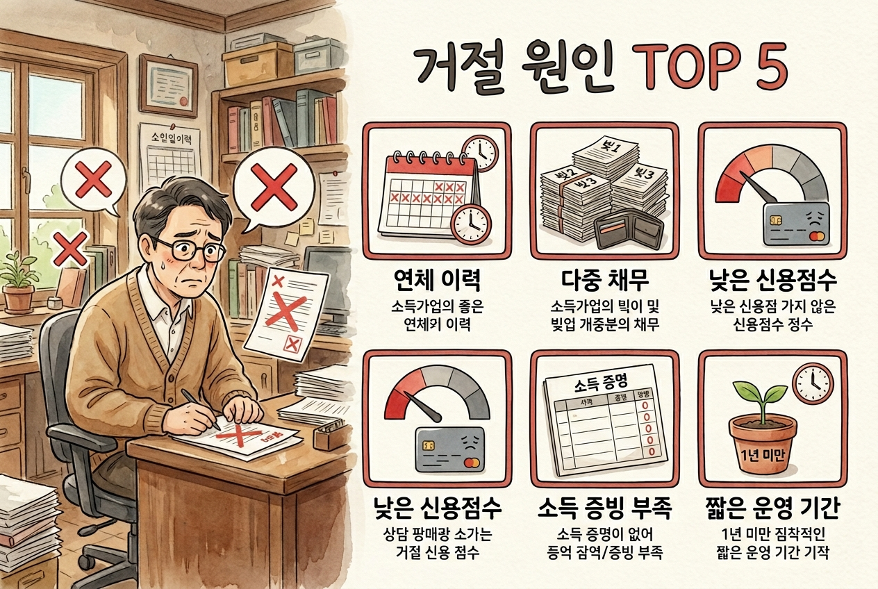 첫째, 소득증빙 불가예요. 현금 매출 비중이 높아서 부가가치세 신고 금액이 실제 소득보다 낮으면 연소득 기준을 충족하지 못합니다. 둘째, 연체 이력은 가장 치명적인 부결 사유로, 최근 3개월 내 30일 이상 연체 기록이 있으면 거의 100% 거절됩니다.