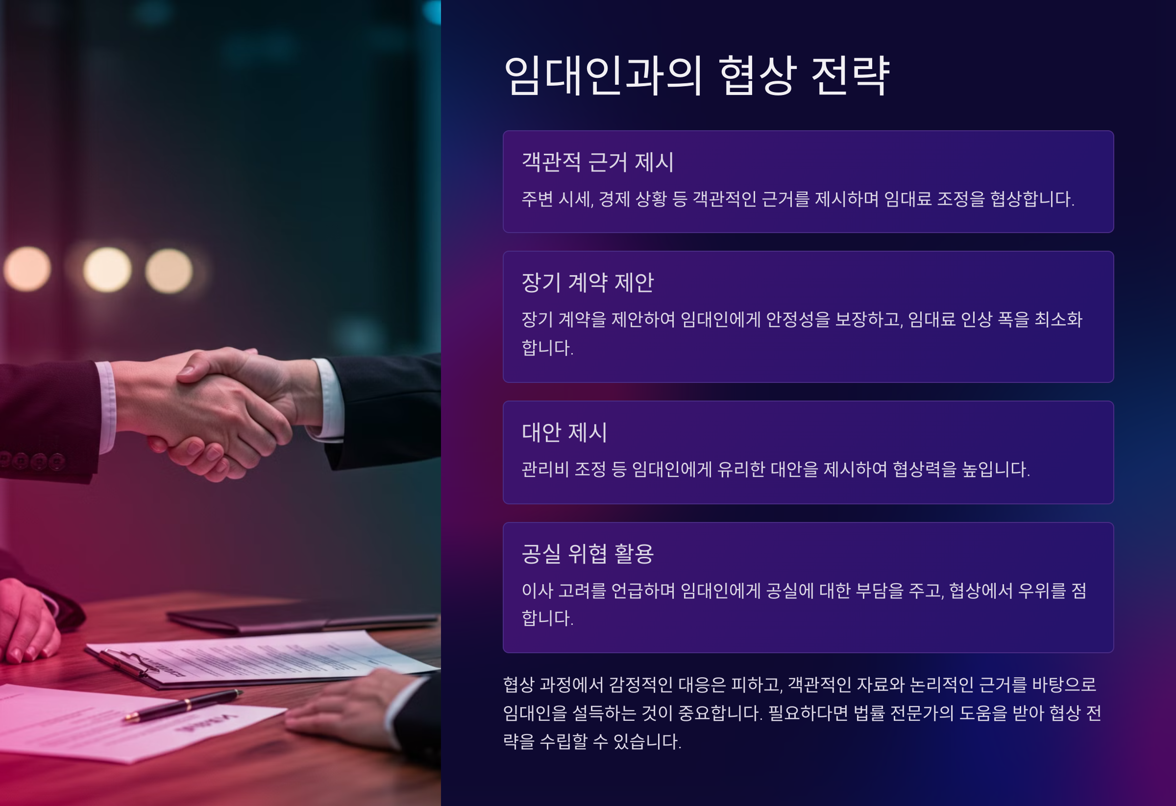 - 임대료 인상 요구 시 시장 평균 임대료 데이터를 근거로 협상하세요.