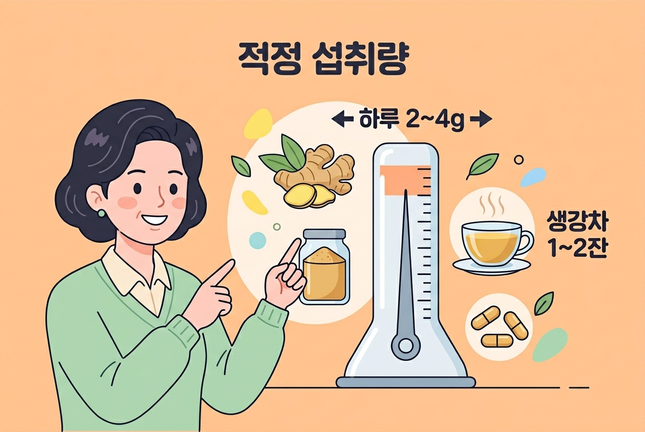 A1. 일반 성인 기준 하루 2~4g(생강 원물 기준)이 적정 섭취량입니다. 6g 이상 과다 섭취 시 속쓰림, 설사, 위산 역류 등의 부작용이 나타날 수 있습니다(WebMD).