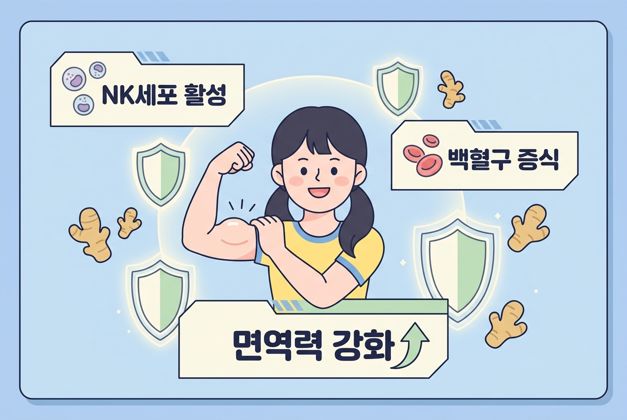 생강의 진저롤과 쇼가올 성분은 백혈구 수를 늘리고 NK세포(자연살해세포)의 활성을 높여 바이러스 감염에 대한 방어력을 향상시킵니다. 시민뉴스(2025)에 따르면, 서울대 약학대 연구진이 생강 추출물의 NK세포 활성 증가 효과를 보고한 바 있어요.