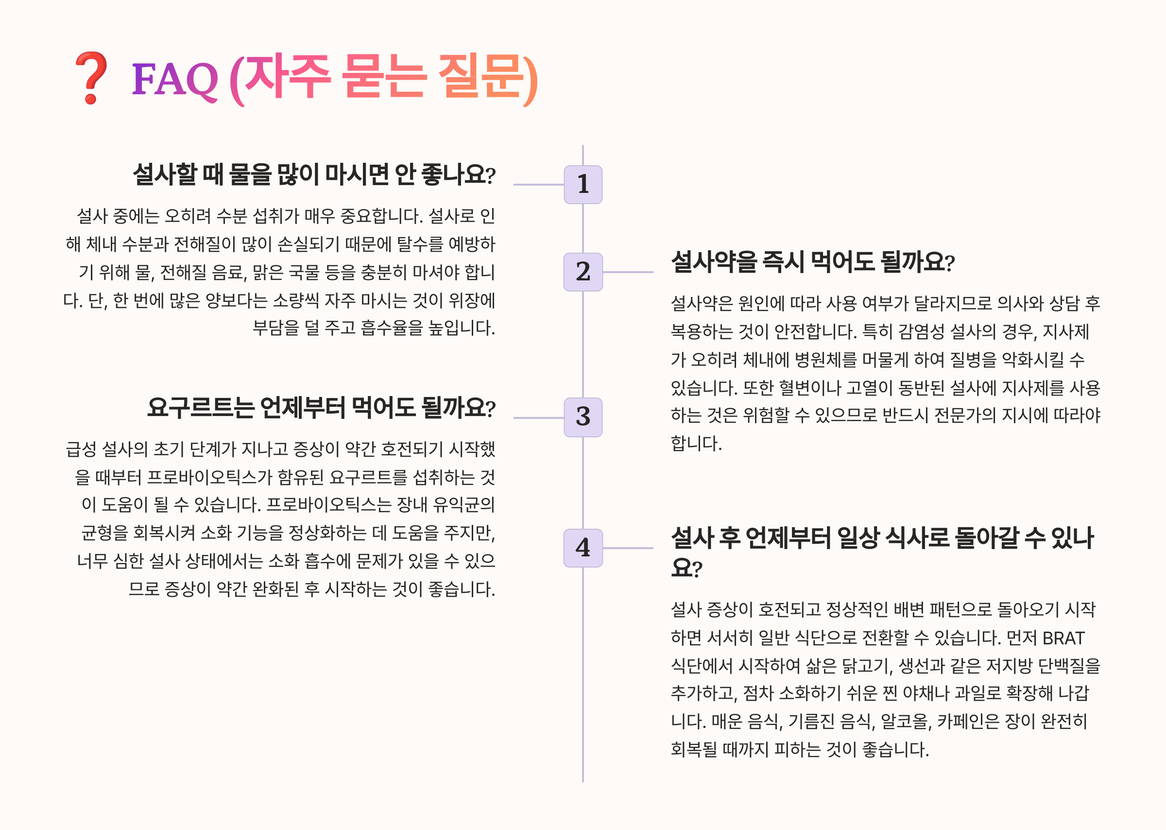 이제 설사를 예방하는 방법까지 완벽히 알았어요! 😊 마지막으로, 설사에 대해 자주 묻는 질문(FAQ)을 정리해볼게요! 🔍