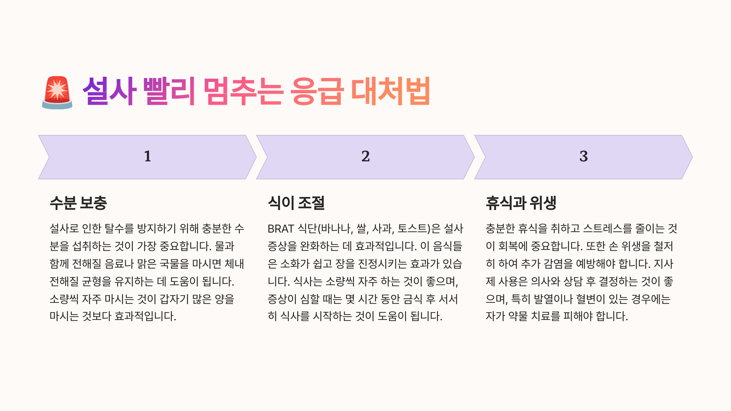 설사가 시작되면 아래 방법을 순서대로 실천해 보세요. ⏳
