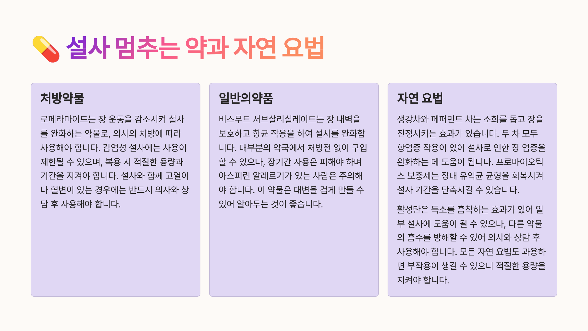 이제 설사할 때 먹어야 할 음식과 피해야 할 음식도 알았어요! 다음은 설사를 멈추는 약과 자연 요법을 알아볼 차례예요. 💊