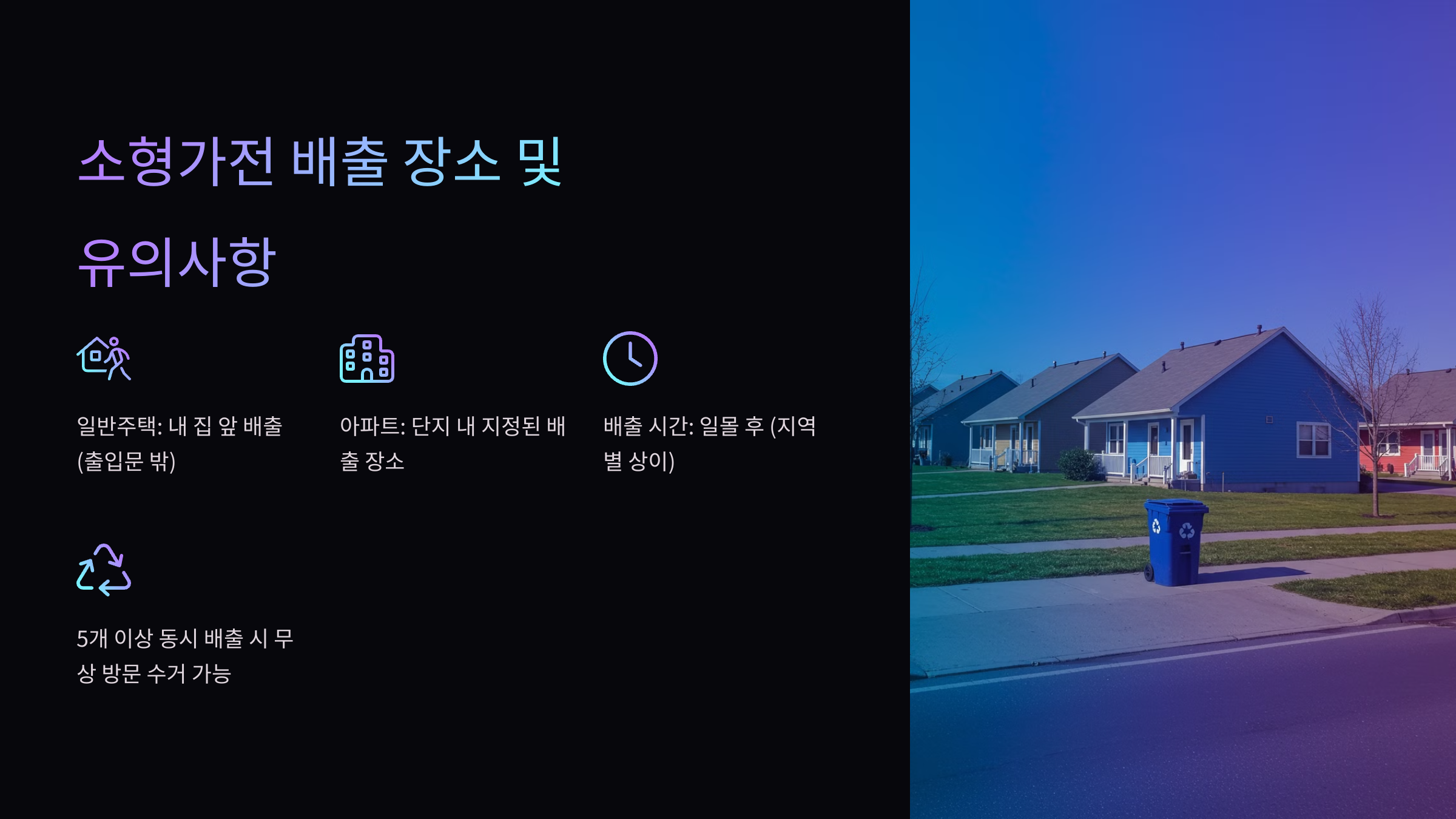 - 운영 시간 확인: 주민센터 및 아파트 수거장은 운영 시간이 정해져 있음