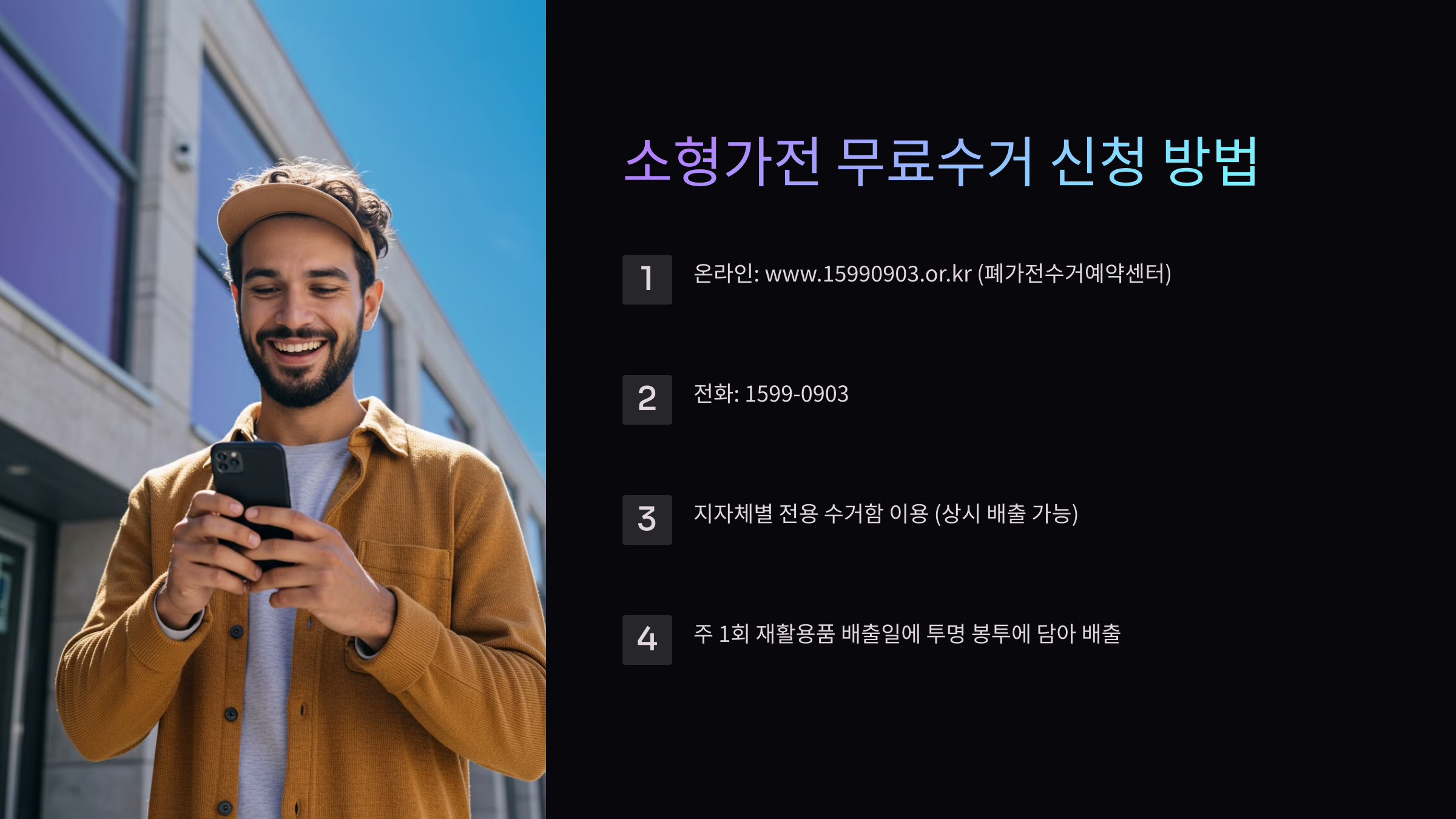 소형가전 무료수거 품목을 미리 확인하면 불필요한 불편을 줄일 수 있어요. 다음으로 소형가전 무료수거 신청방법을 알아볼게요! 🚀