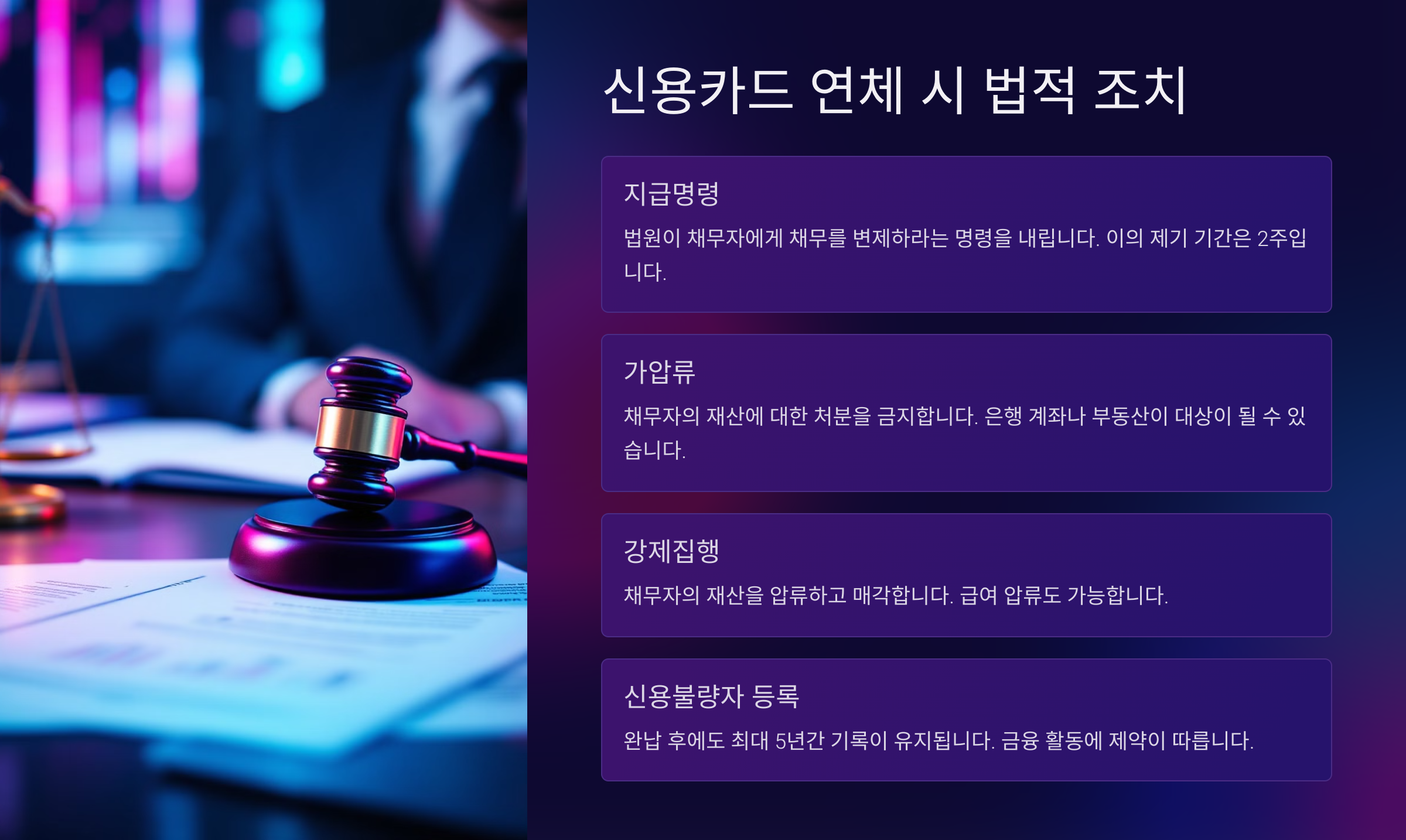 신용카드 연체가 90일 이상 지속되면 채권 추심, 급여 압류 등 법적 대응이 시작될 수 있어요. 카드사는 연체자의 채권을 채권추심회사에 넘기거나 직접 법적 소송을 진행할 수 있어요. 📜