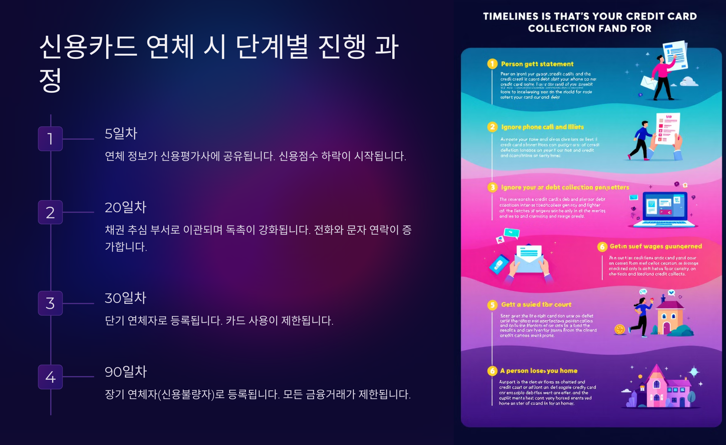 - 🚨 90일 이상 연체: 카드사의 법적 조치가 시작되며, 채권 추심이 진행될 수 있어요. 최악의 경우 법적 소송까지 이어질 수 있어요.