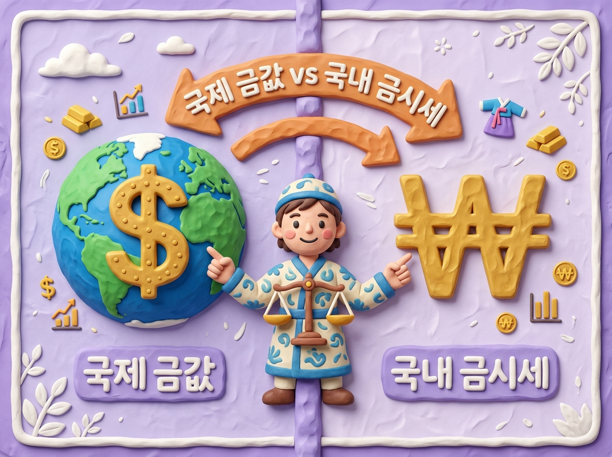 국내 금시세는 국제 시세에 환율을 곱하고, 여기에 부가가치세 10%와 유통 마진이 추가됩니다. 따라서 "내가 살 때" 가격이 국제 시세 대비 상당히 높게 형성되는 것이 정상이에요. 금을 매수할 때는 이 차이를 반드시 감안해야 합니다.