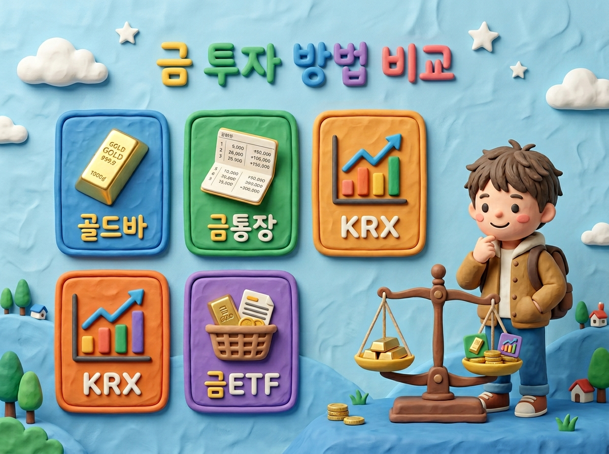 금에 투자하는 방법은 크게 실물 금(골드바), 금통장, KRX 금시장, 금 ETF 네 가지로 나뉩니다. 각각 세금, 수수료, 접근성에서 차이가 있으므로 본인의 투자 목적에 맞는 방법을 선택하는 것이 중요해요.