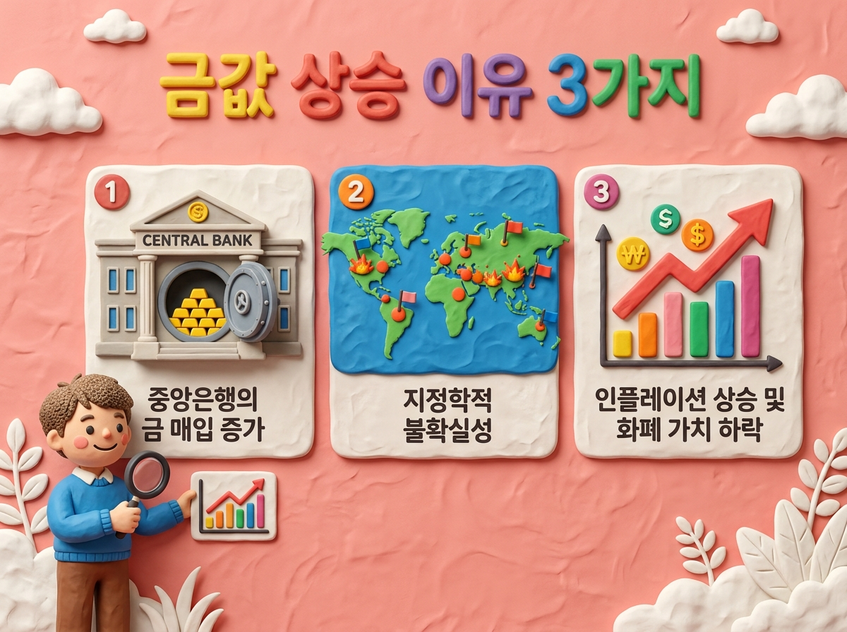금값 상승의 핵심 원인은 신흥국 중앙은행의 금 매입 확대, 지정학적 불안, 인플레이션 우려입니다. 금 투자를 고려하신다면 본인의 투자 성향에 맞는 방법을 선택하되, 매수·매도 스프레드와 세금 구조를 꼼꼼히 비교해 보시길 권합니다.
