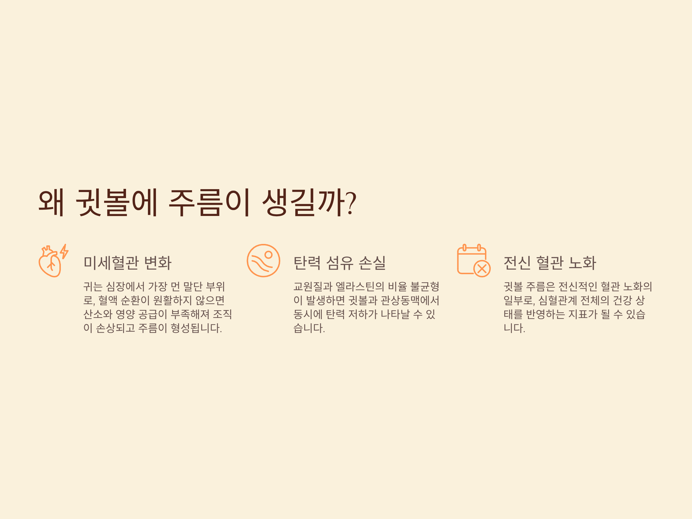 | 교원질-엘라스틴 불균형 | 피부 탄력 섬유 비율 변화 | 귓볼과 혈관 동시 약화 |