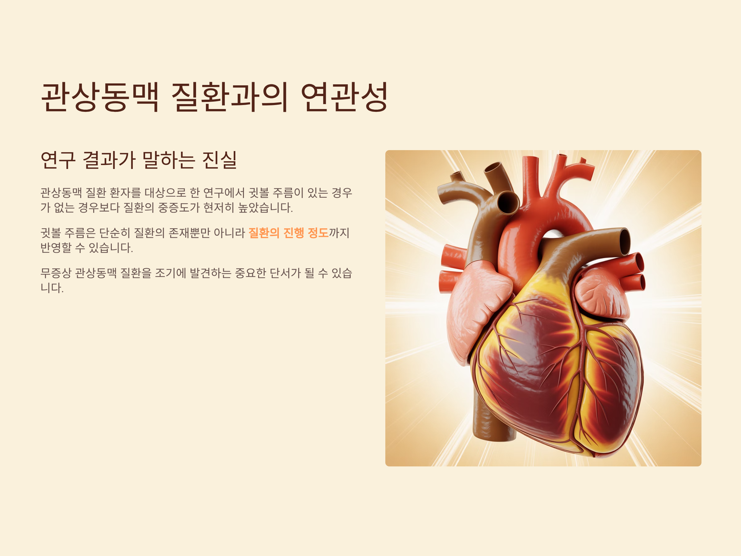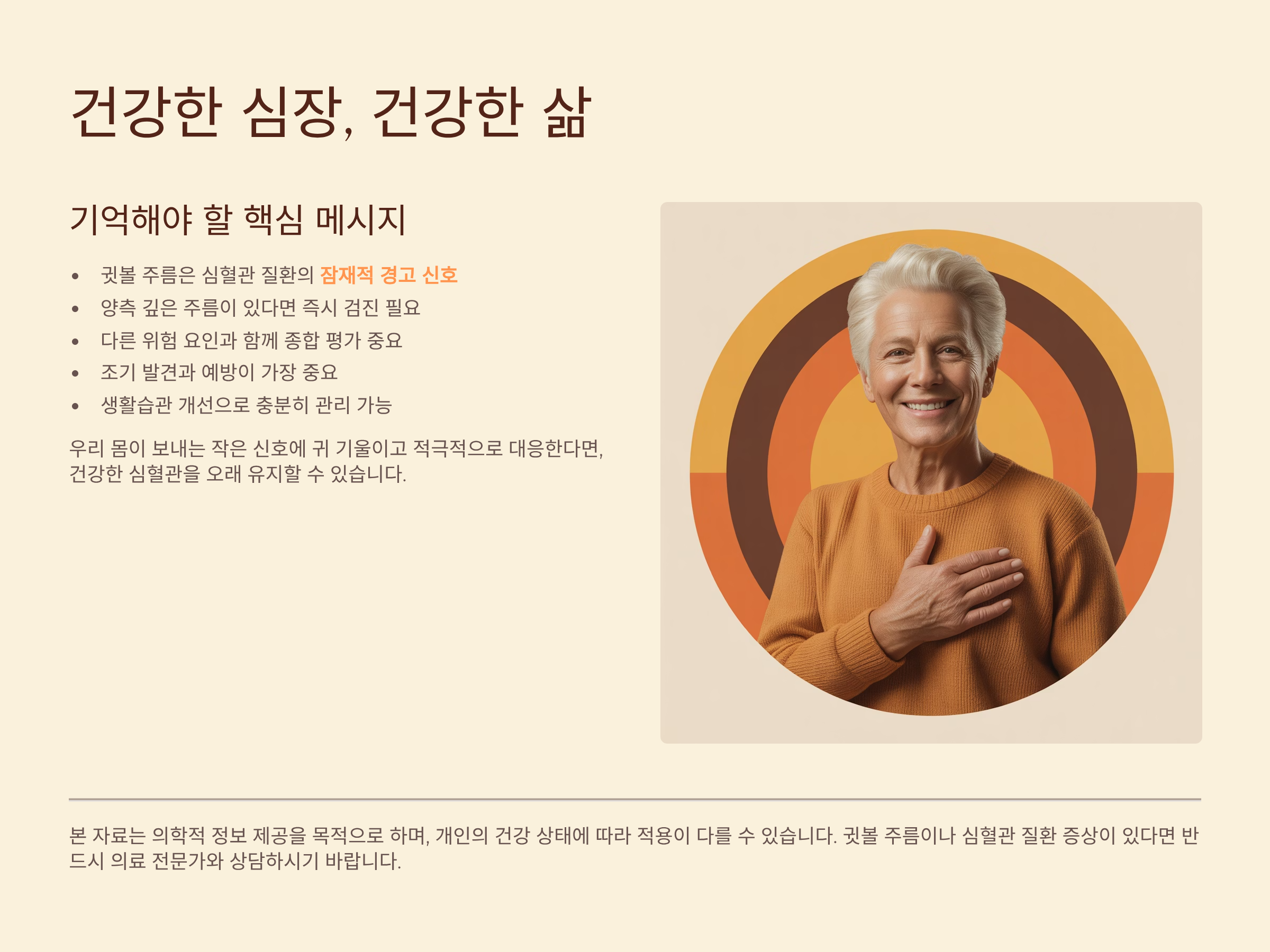 본 글은 의학적 정보 제공을 목적으로 작성되었으며, 개인의 건강 상태에 따라 적용이 다를 수 있습니다. 귓볼 주름이나 심혈관 질환 증상이 있다면 반드시 의료 전문가와 상담하시기 바랍니다.