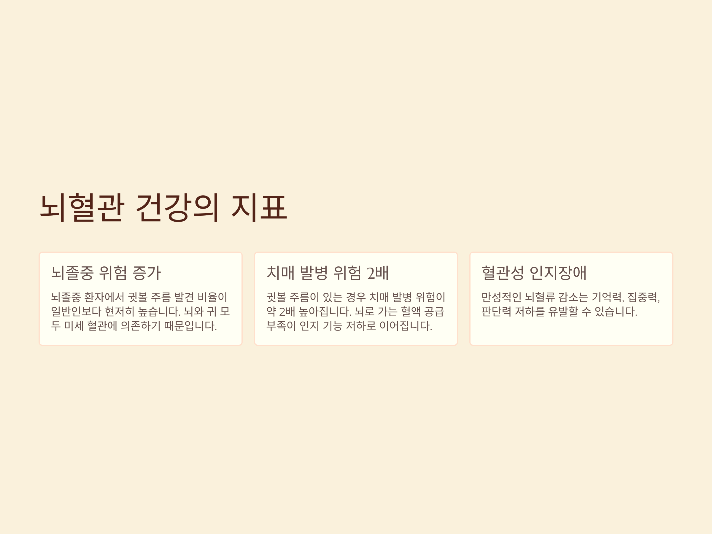 귓볼 주름은 심장뿐만 아니라 뇌혈관 건강과도 깊은 연관이 있습니다. 뇌졸중 환자를 대상으로 한 연구에서 귓볼 주름이 발견되는 비율이 일반인보다 현저히 높았으며, 이는 뇌혈관의 건강 상태를 간접적으로 보여주는 지표로 해석됩니다. 뇌와 귀 모두 미세한 혈관에 의존하기 때문에 혈관 건강 악화가 동시에 나타날 수 있습니다.