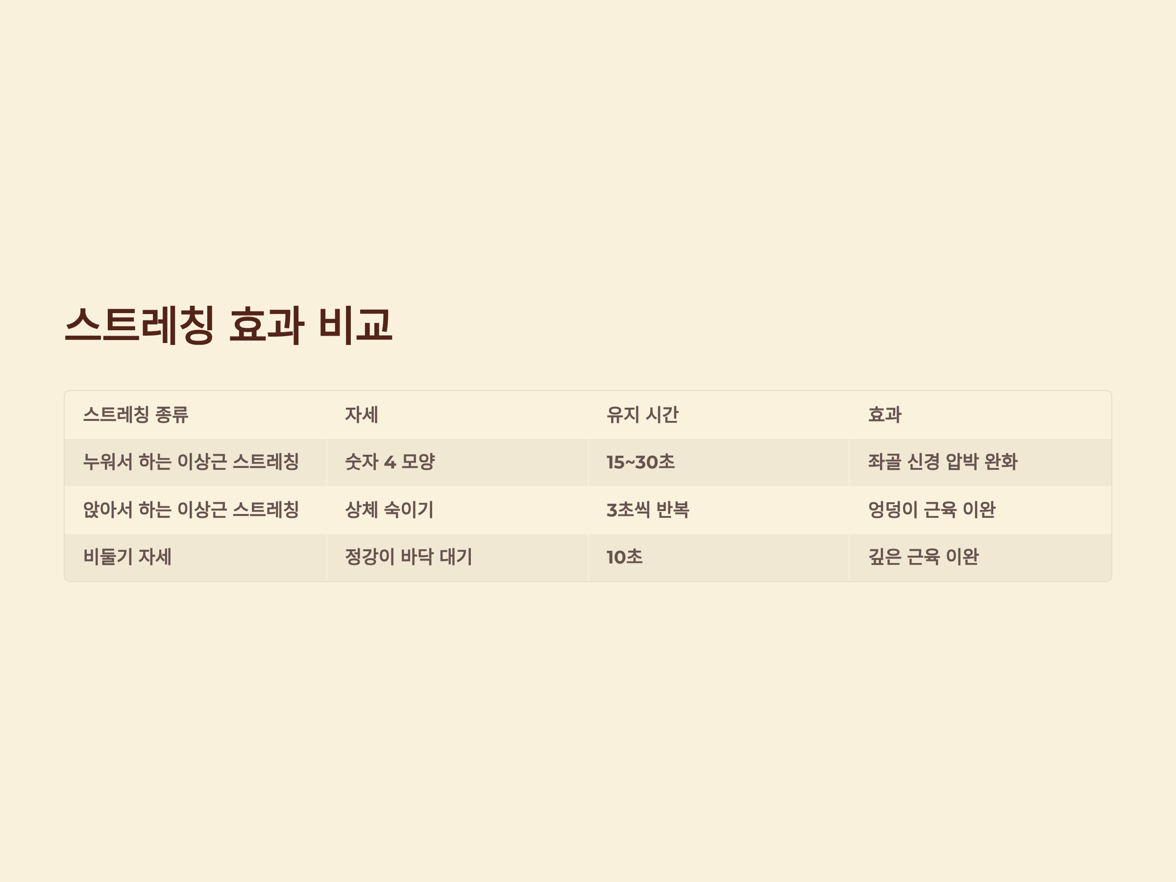 엉덩이 통증은 장시간 앉아 있는 습관으로 인한 이상근 긴장이 주된 원인이며, 규칙적인 스트레칭으로 충분히 완화할 수 있습니다. 이상근 스트레칭, 고관절 스트레칭, 나비 자세, 고양이 소 자세 등을 주 3~5회 실시하고, 1시간마다 자세를 변경하며, 바른 자세를 유지하는 것이 중요합니다.