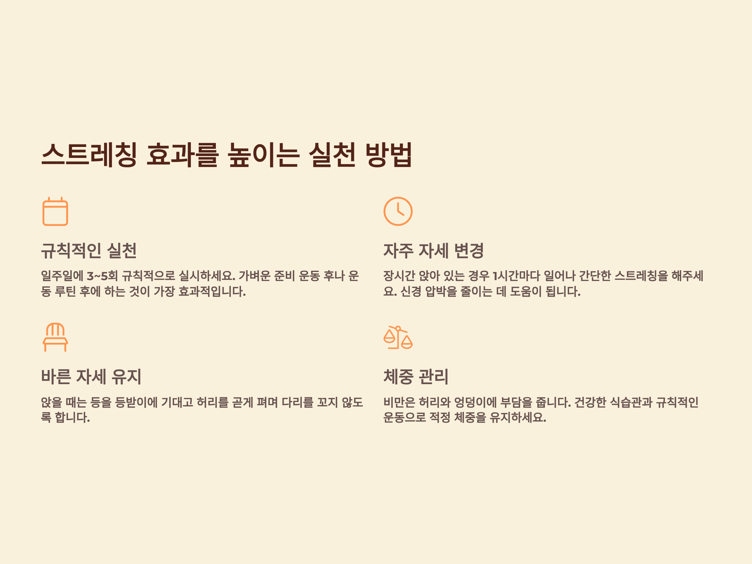스트레칭 효과를 극대화하려면 일주일에 3~5회 규칙적으로 실시하는 것이 중요합니다. 가벼운 준비 운동 후나 운동 루틴 후에 하는 것이 가장 좋으며, 장시간 앉아 있는 경우 1시간마다 일어나 간단한 스트레칭을 해주세요.