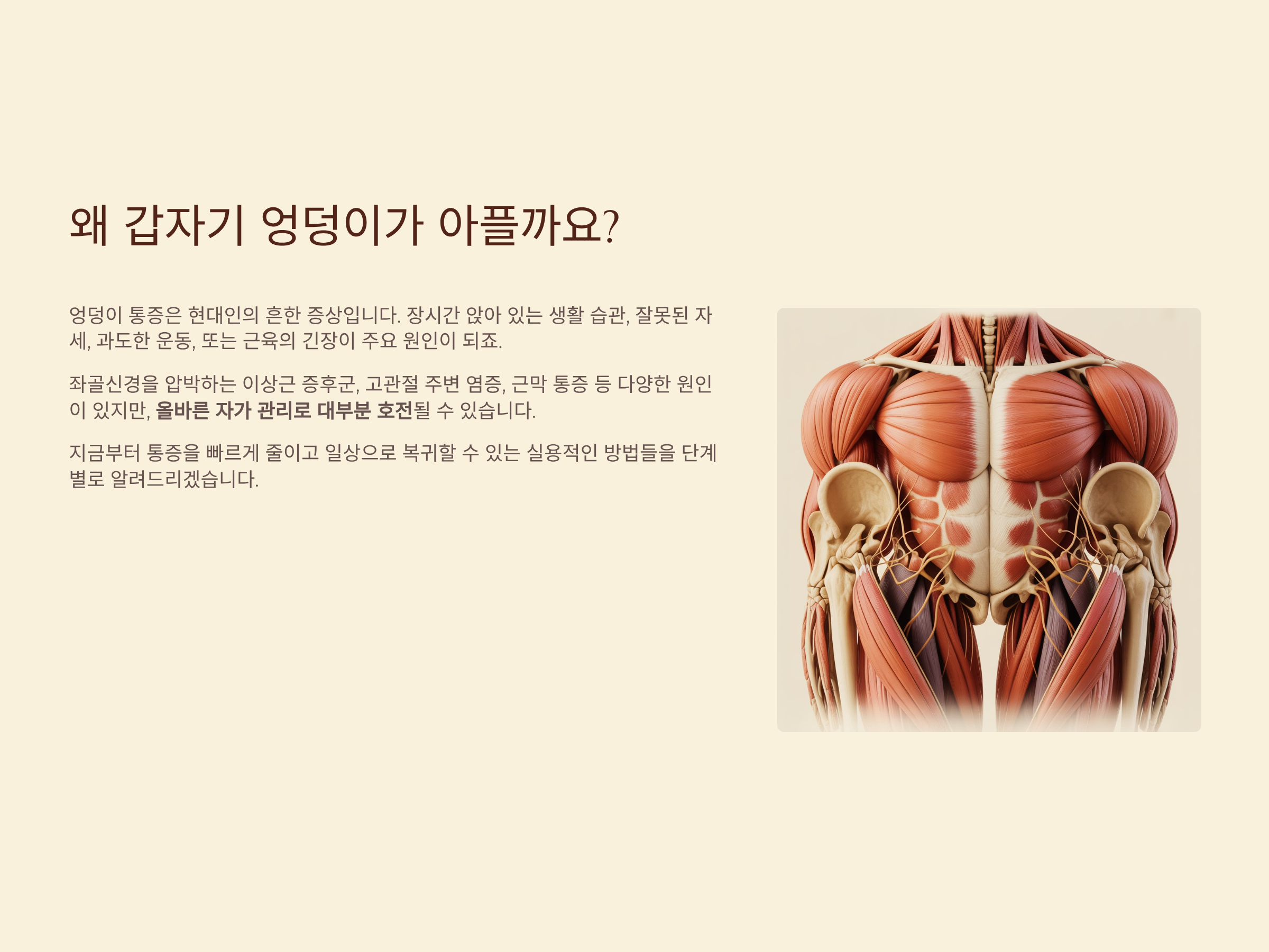 단, 통증이 일주일 이상 지속되거나 다리 저림, 힘 빠짐 등의 증상이 동반되면 반드시 전문의 진료를 받아야 합니다. 꾸준한 자가 관리로 통증 없는 건강한 일상을 되찾으시기 바랍니다.