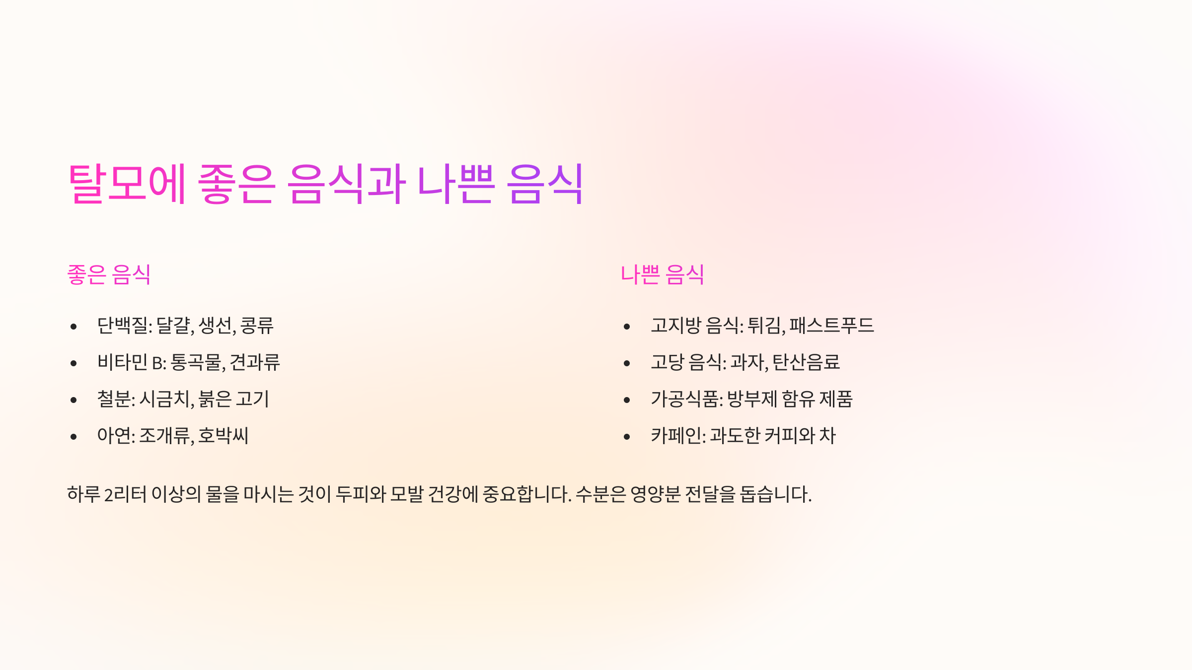 | 단백질 | 계란, 두부, 닭가슴살 | 모발 생성 재료 | 탄수화물 위주 식사 |