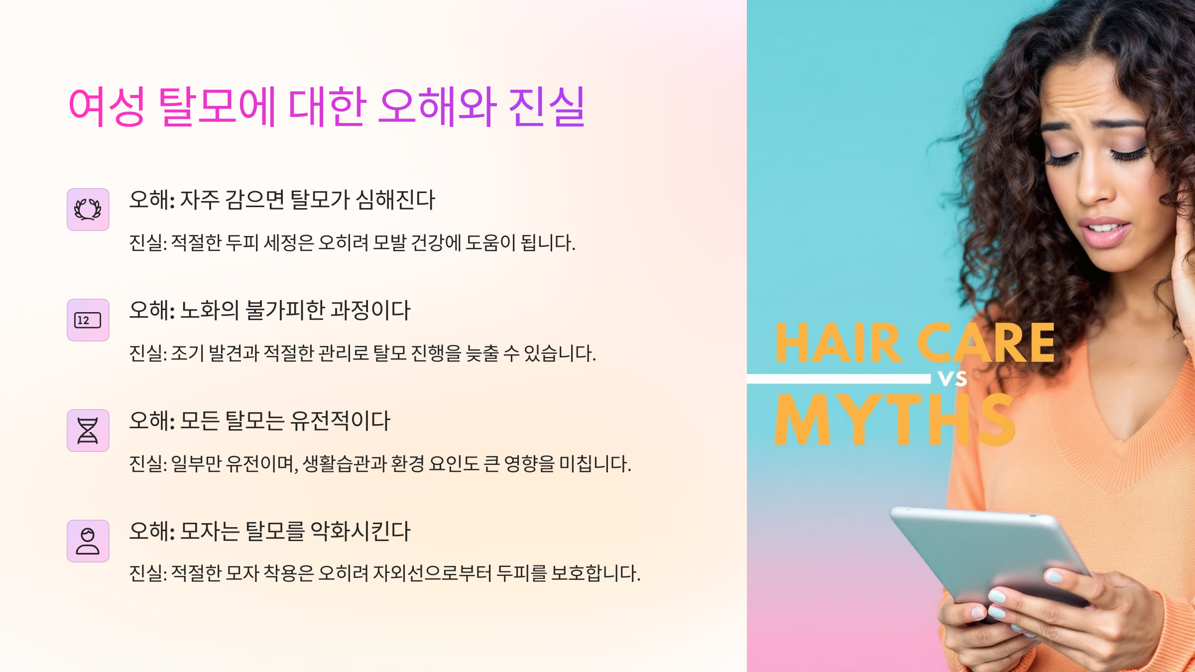 가장 대표적인 오해는 "여성은 탈모가 거의 없다"는 말이에요. 사실 여성의 절반 가까이가 평생 한 번쯤은 탈모 증상을 겪는다고 해요. 단지 남성처럼 눈에 띄지 않을 뿐이죠.