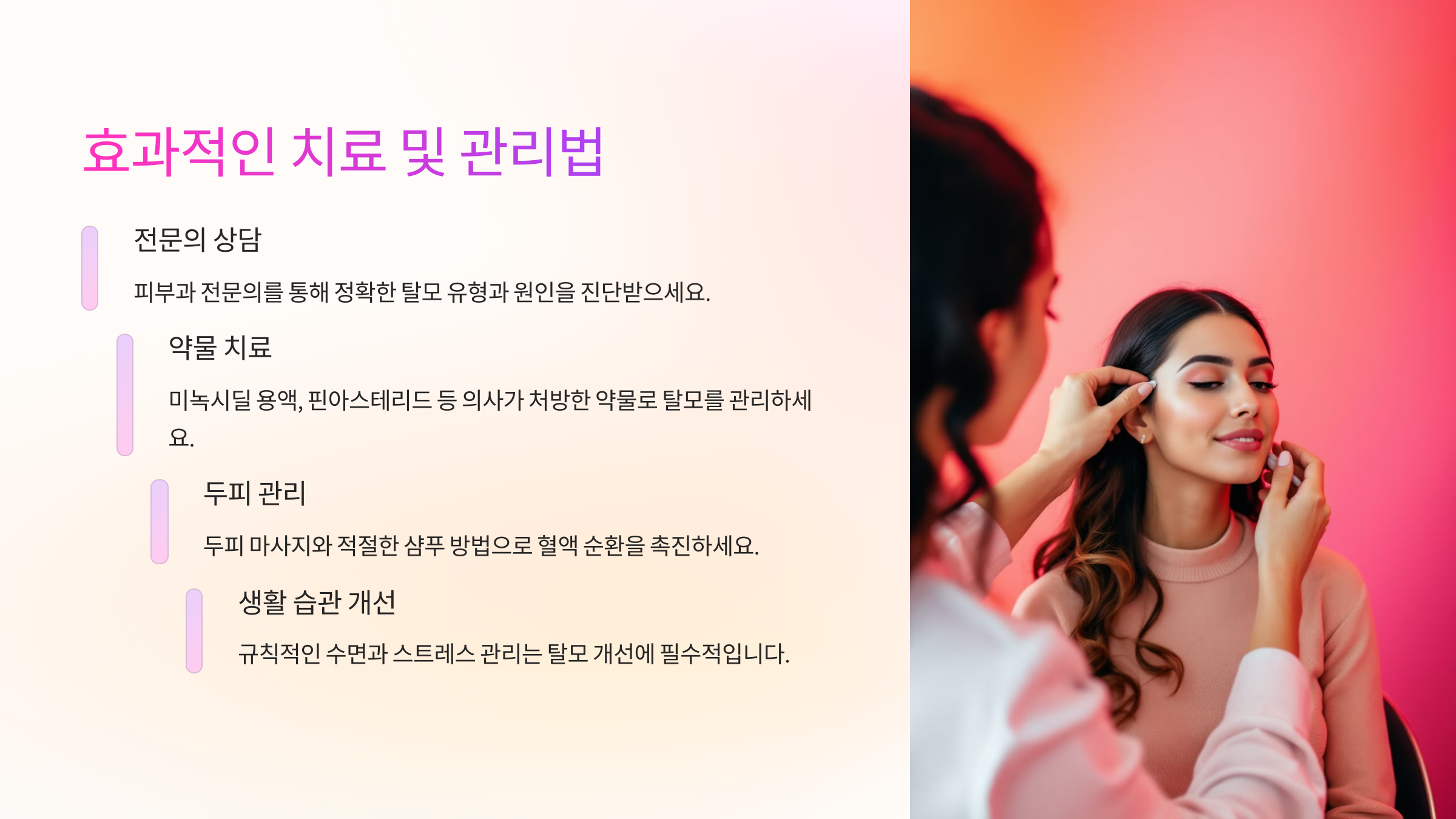 그렇지만 다행히도, 여성 탈모는 조기에 인지하고 꾸준히 관리하면 충분히 개선될 수 있어요. 요즘은 효과적인 치료 옵션도 많고요. 내가 생각했을 때, 탈모는 신체 이상을 알려주는 조용한 알람 같아요. 단순히 모발만의 문제가 아니에요.