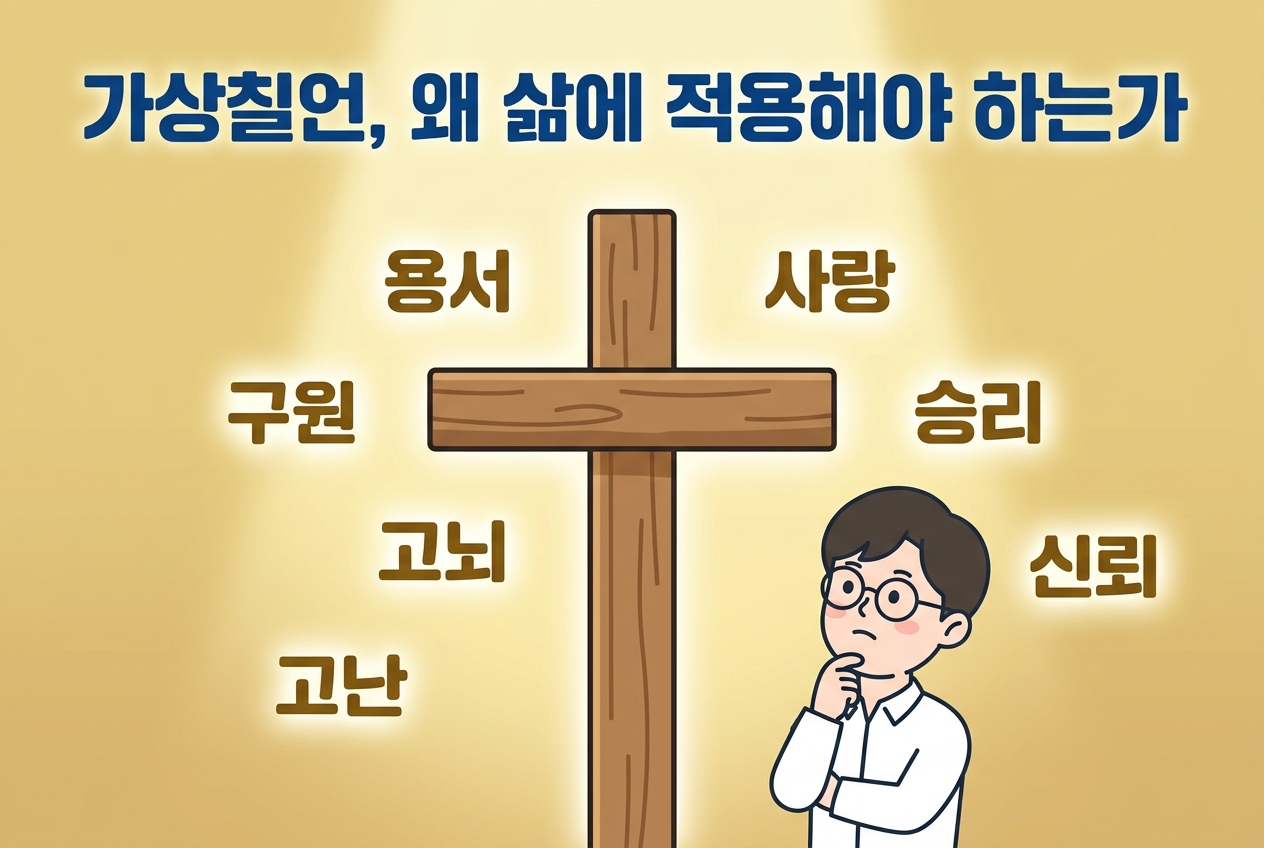많은 분들이 가상칠언의 뜻은 알지만, 정작 "이 말씀이 오늘 내 기도와 무슨 관계가 있지?"라고 물으시곤 해요. 핵심은 이것입니다. 가상칠언의 7가지 주제(용서·구원·사랑·고뇌·고난·승리·신뢰)는 우리가 매일 겪는 감정과 상황에 정확히 대응하는 말씀이라는 점이에요.