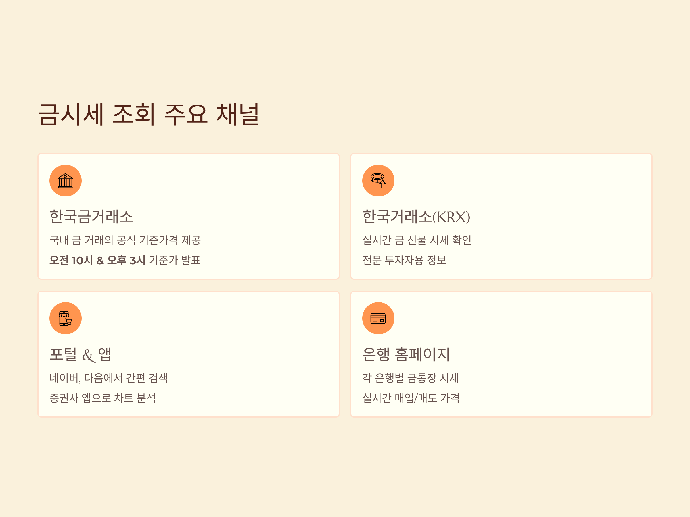 금시세는 한국금거래소, 한국거래소(KRX), 각 은행 홈페이지에서 실시간으로 확인할 수 있습니다. 한국금거래소는 국내 금 거래의 기준이 되는 공식 시세를 제공하며, 매일 오전 10시와 오후 3시에 기준가격을 발표합니다. 각 금은방이나 귀금속 매장에서는 이 기준가격에 수수료를 더해 판매가격을 책정합니다.
