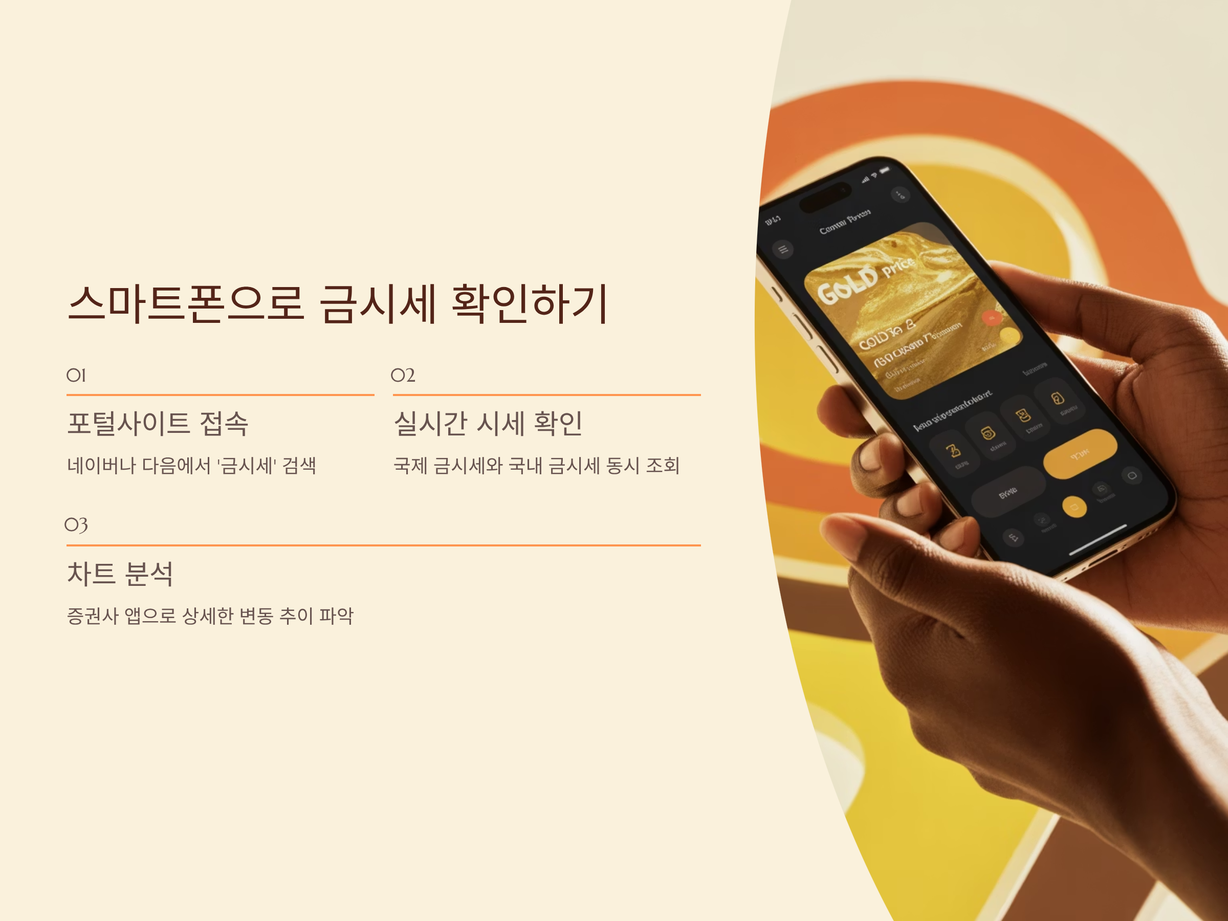 스마트폰을 활용한 금시세 조회도 매우 편리합니다. 네이버, 다음 등 포털사이트에서 '금시세'를 검색하면 실시간 국제 금시세와 국내 금시세를 동시에 확인할 수 있습니다. 특히 증권사 앱이나 금융 앱을 통해서는 차트와 함께 상세한 시세 변동 추이를 볼 수 있어 투자 판단에 도움이 됩니다.