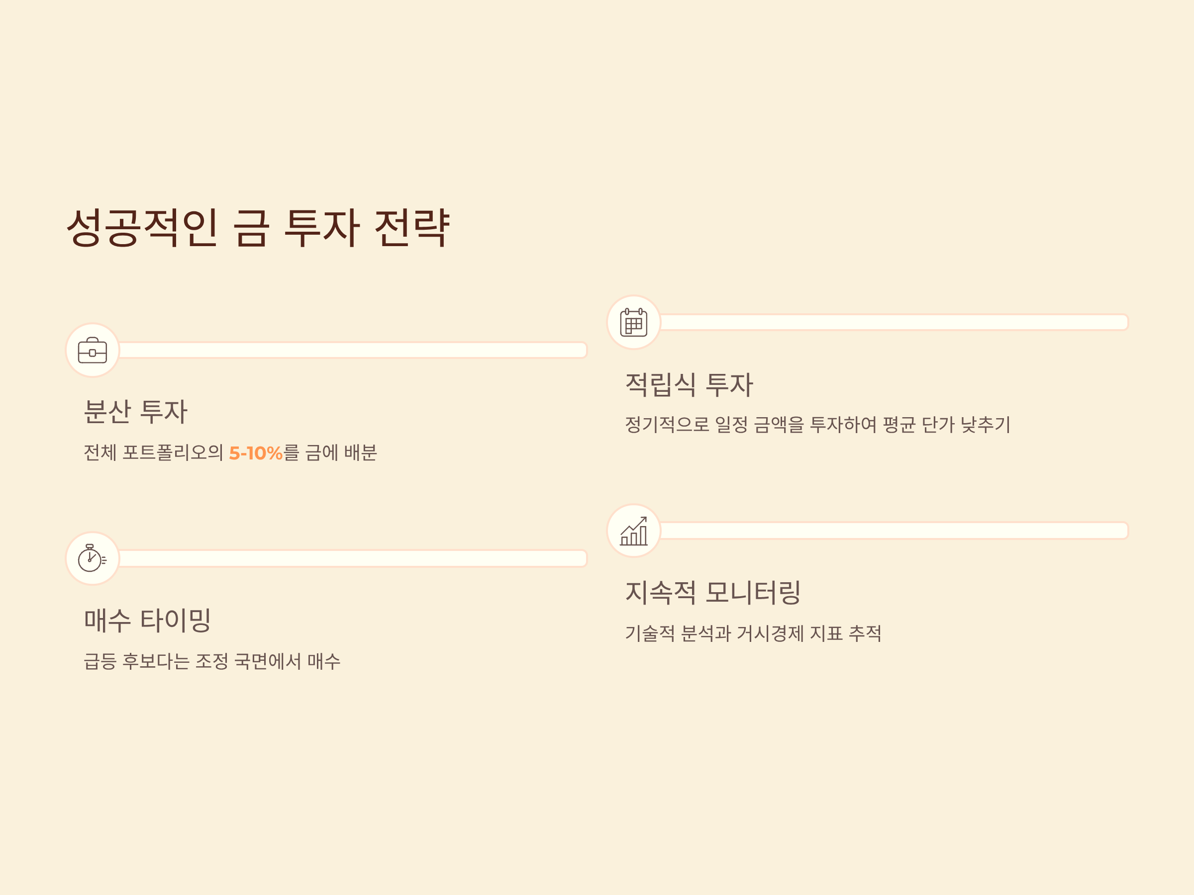 성공적인 금 투자를 위해서는 장기적 관점의 분산 투자가 중요합니다. 전체 포트폴리오의 5-10% 정도를 금에 배분하는 것이 일반적인 권장 사항입니다. 또한 정기적으로 일정 금액을 투자하는 적립식 투자를 통해 평균 매입 단가를 낮추는 전략도 효과적입니다.
