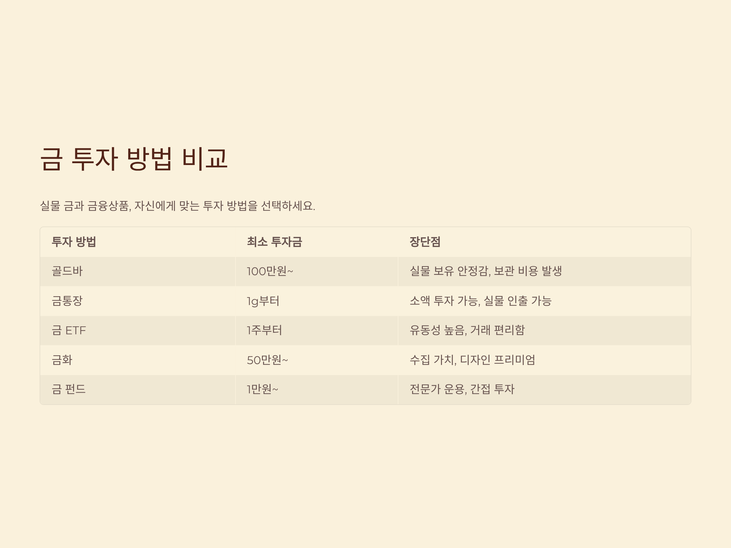 | 골드바 | 100만원~ | 실물 보유, 보관 비용 |