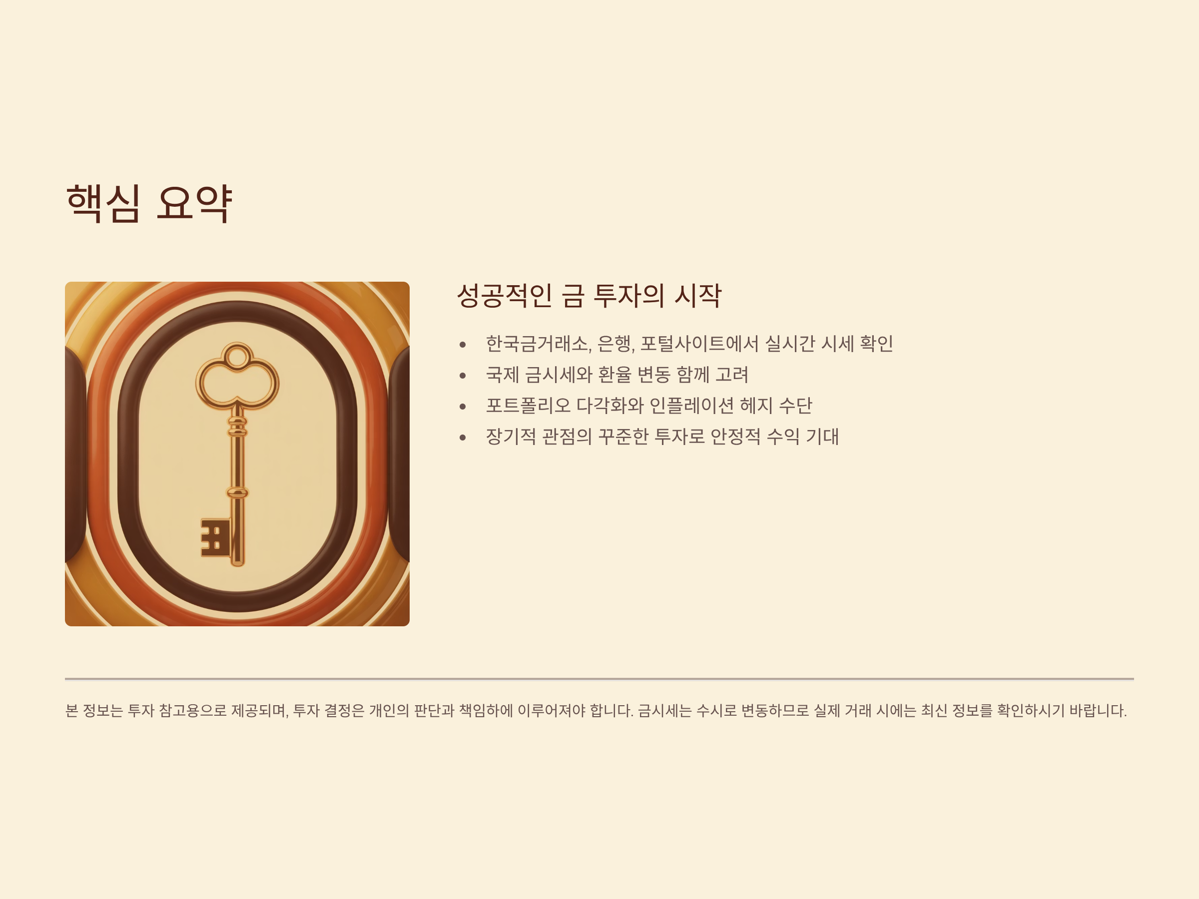 * 본 정보는 투자 참고용으로 제공되며, 투자 결정은 개인의 판단과 책임하에 이루어져야 합니다. 금시세는 수시로 변동하므로 실제 거래 시에는 최신 정보를 확인하시기 바랍니다.