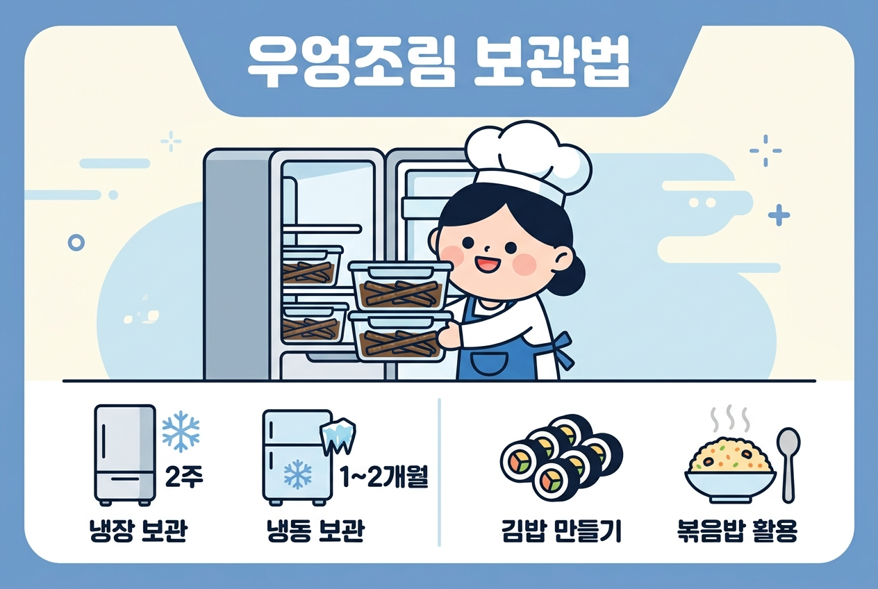 완성된 우엉조림은 밀폐 용기에 담아 냉장 보관 시 약 2주, 냉동 보관 시 최대 1~2개월까지 보관이 가능해요. 조림 양념 자체에 간장과 설탕이 들어있어 일반 반찬보다 보존 기간이 긴 편이에요.