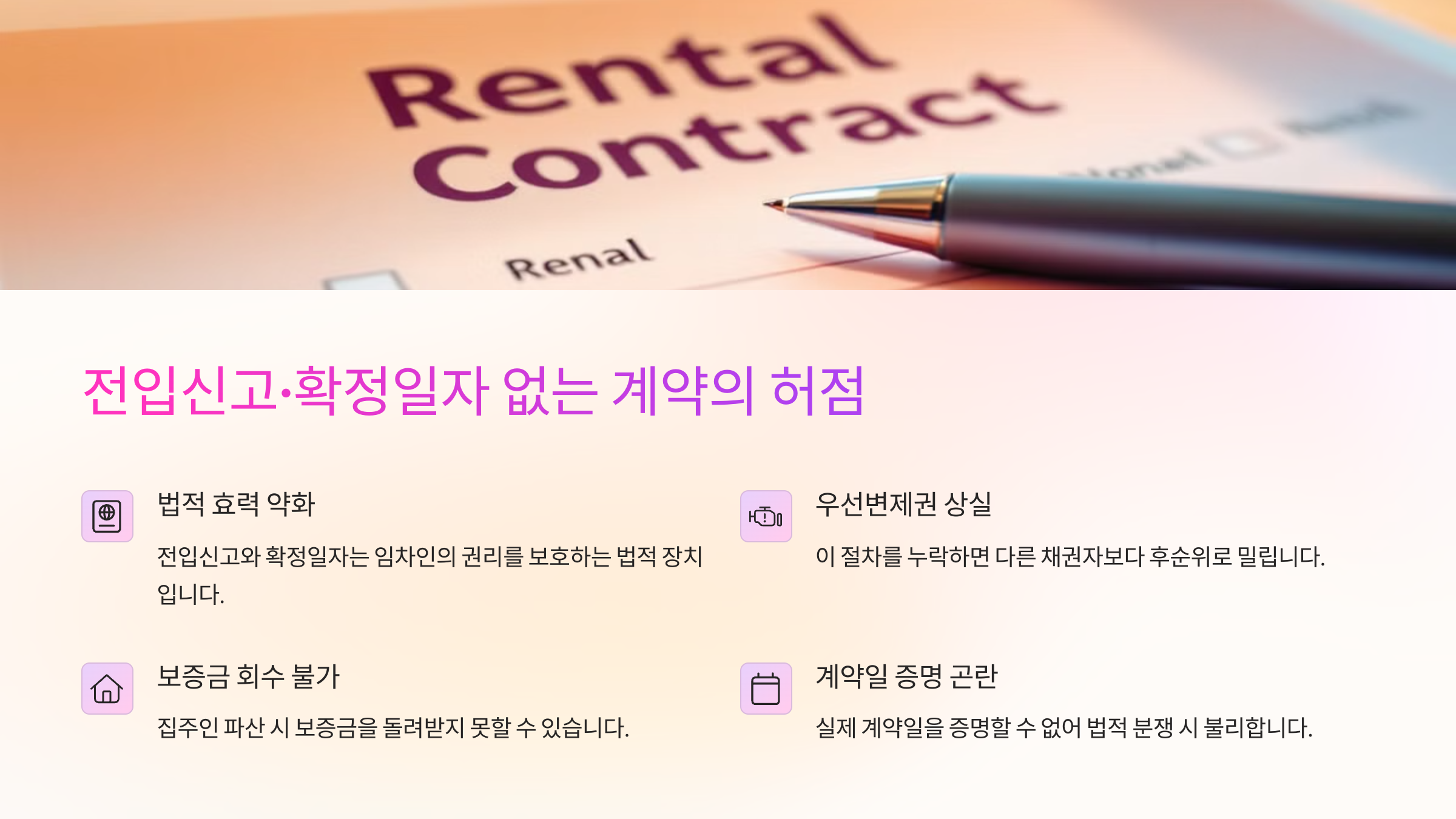| 전입신고 | 대항력 없음, 경매 시 무력화 | 입주 후 즉시 주민센터 신고 |