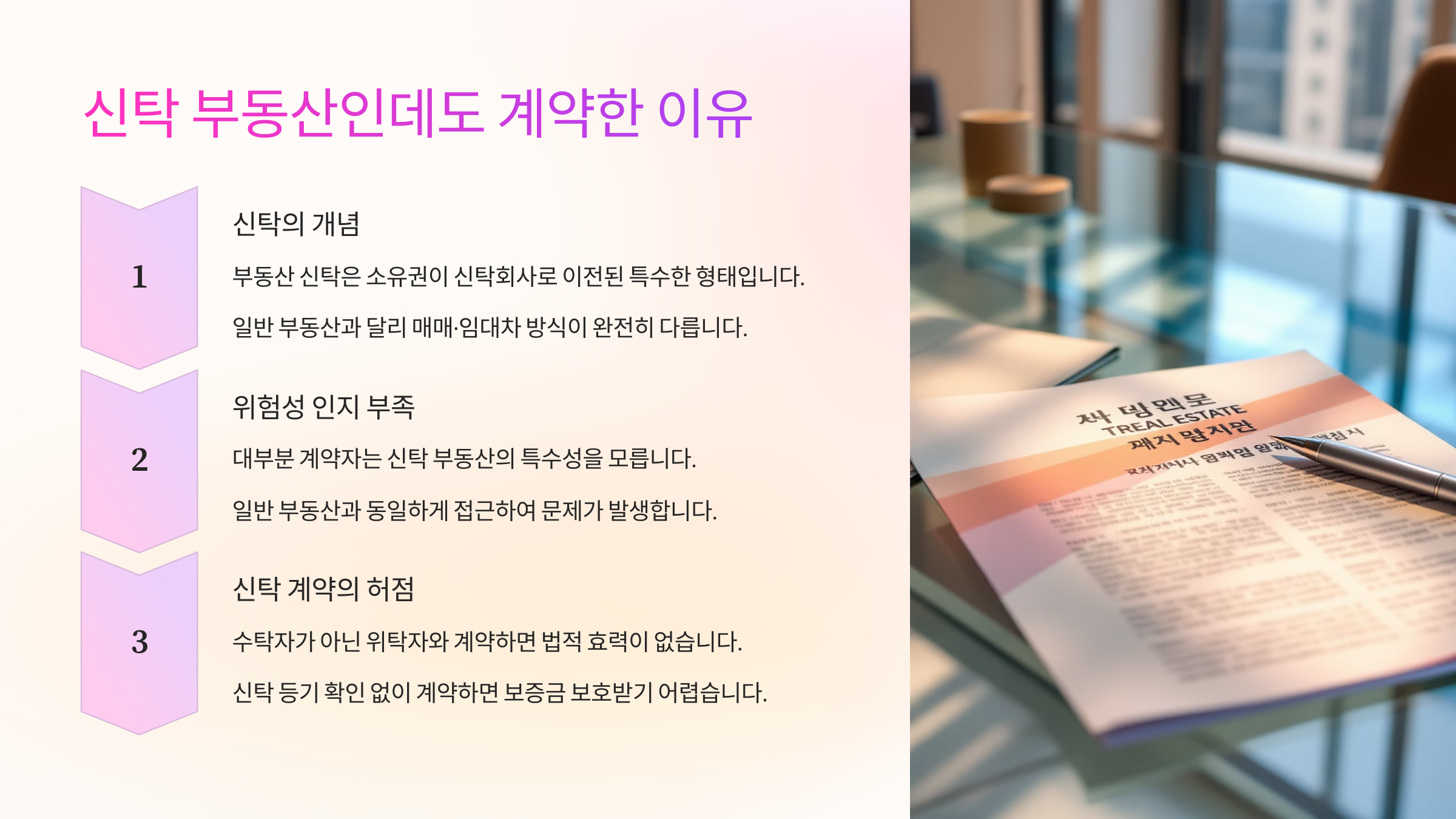 요즘 부동산 계약 사기 중에서도 가장 치명적인 게 바로 '신탁 부동산' 관련 문제예요. 그런데 정말 놀라운 건, 등기부등본에 ‘OO신탁’이라고 분명히 적혀 있는데도 아무 의심 없이 계약을 해버리는 사람이 많다는 거예요. 왜냐면 대부분은 ‘신탁’이 뭔지도 모르고, 중개사도 그냥 넘어가는 경우가 많거든요.